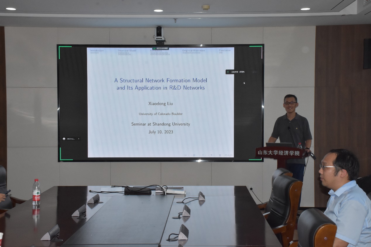 7月10日下午,必赢线路检测中心第318期高级经济学讲座于中心校区知新楼B321举行,科罗拉多大学博尔德分校经济学教授刘晓冬作了题为“A Structural Network Formation Model andIts Application in R&D Networks”的报告。讲座由必赢线路检测中心周剑南助理研究员主持,部分师生参会。