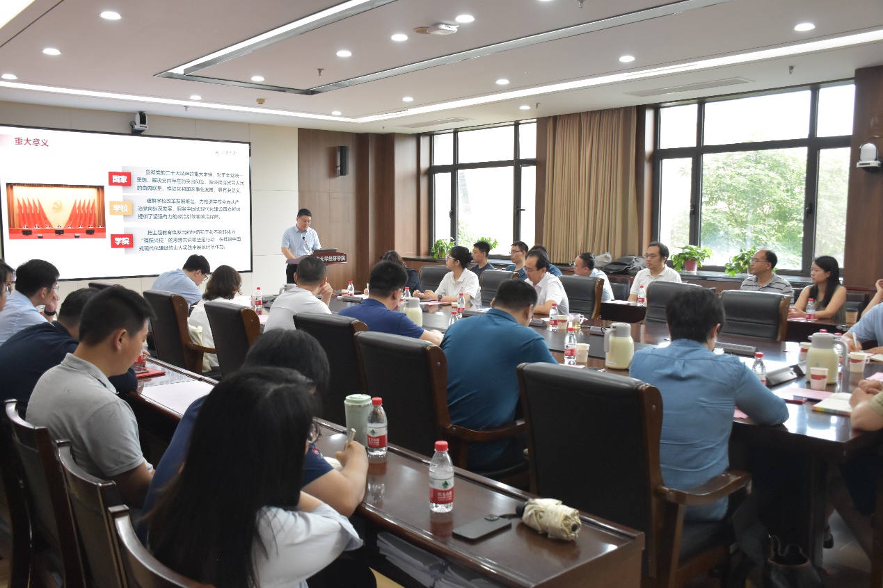 董春杰以“深入开展学习贯彻习近平新时代中国特色社会主义思想主题教育,推进一流必赢线路检测中心建设”为题讲授主题教育专题党课。董春杰结合习近平总书记重要讲话精神,从国家、学校和学院三个层面分别梳理了开展学习贯彻习近平新时代中国特色社会主义思想主题教育的重大意义和目标要求。随后,他总结概括了学院在以学铸魂、以学增智、以学正风、以学促干方面取得的工作成效,全面总结理论学习、调查研究和推动发展情况,提出了显著提高拔尖创新人才自主培养质量、大力推进学科出尖出峰、着力打造中国特色经济学“山大学派”、打造一流人才队伍等8个方面的具体措施,进一步完善学院整改落实方案,切实将学习成效转化为推动学院高质量发展的治本之策。结合工作实际,他讲述了运用“金钥匙”的心得体会,围绕学习习近平总书记关于“坚定不移全面从严治党,深入推进新时代党的建设伟大工程”的重要论述以及习近平新时代中国特色社会主义思想世界观和方法论的科学体系等,介绍了学院在推进政治建设、思想建设、组织建设、作风建设、纪律建设、制度建设方面的工作开展情况,介绍了学院创新用好“两个结合”“六个必须坚持”等习近平新时代中国特色社会主义思想的立场观点方法改进工作、推动发展举措办法,积极推进学院在中国式现代化建设的山大实践中展现经院作为。