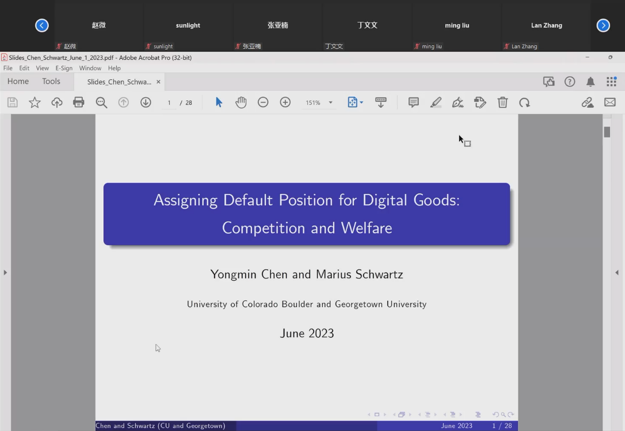 首先,科罗拉多州立大学Yongmin Chen教授作了题为“Assigning Default Position: Bidding vs. Regulation”的主旨报告,报告提出,目前多数消费者倾向于使用默认选项以避免转换成本的现状,报告基于此构建两公司向第三方消费者提供不同质量产品的模型,对消费者的选择和福利进行验证。研究发现,提供较高质量产品的公司通常会赢得默认位置的竞标,但给消费者带来的效用却低于该公司的竞争者,且通过监管提高产品质量较低公司的默认份额的做法会降低消费者福利,在制定政策时需要对消费者与总体福利进行权衡。