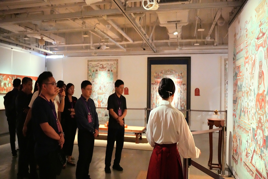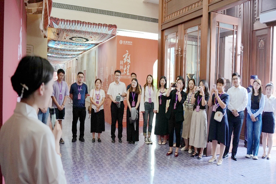 活动中,经院师生沉浸式体验了位于北京银行大厦一层1:1复刻的敦煌莫高窟3号窟和藏经洞实景,感受敦煌壁画的永恒魅力;观摩了位于十一层的京行艺术馆敦煌研究院专业画家牛玉生先生多年临摹、创作的敦煌艺术精品,感受敦煌文化的灿烂辉煌;欣赏了位于十三层的星云大师一笔字展馆的书法作品,深刻体会其所倡导的和谐与爱的处世哲学;参观了古元钱币展,了解中国货币的发展脉络;在京行小剧场,大家现场聆听了由北派琵琶、古典吉他、古筝等中国古典乐器传承人、演奏家、诗歌朗诵家带来的敦煌梦幻曲音乐诗会,精彩的表演、悠扬的旋律带领大家穿越中华千年文明,感知传统文化意蕴。