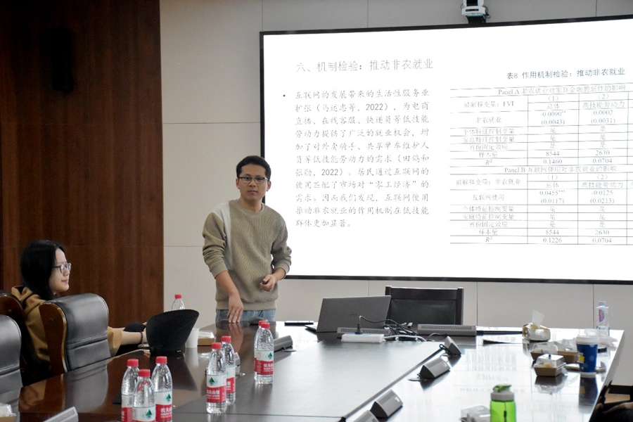 午餐会上,姚健由互联网使用对家庭金融脆弱性影响的问题出发,分享了自己的研究思路和研究过程。他具体介绍了变量选择与数据处理方法,采用财务边际流动资产指标度量家庭金融脆弱性,并以此作为被解释变量,将家庭拥有电脑(台式/笔记本平板等)以及是否使用智能手机作为互联网使用的代理变量,构建核心解释变量,之后利用OLS、Probit及工具变量进行实证检验。报告指出,互联网使用通过推动非农就业、改善健康状况、促进信息获取等渠道降低了家庭金融脆弱性。而且互联网使用对家庭金融脆弱性的抑制作用在欠发达地区和弱势家庭中更为明显,这体现了互联网使用的包容特征。此外,报告进一步分析发现,数字金融发展可以缩小互联网使用带来的数字鸿沟对家庭金融脆弱性的不利影响,从而有助于改善居民的福利状况。在报告过程中,姚健与参会的专家学者围绕报告中的变量设定等问题进行了充分探讨。