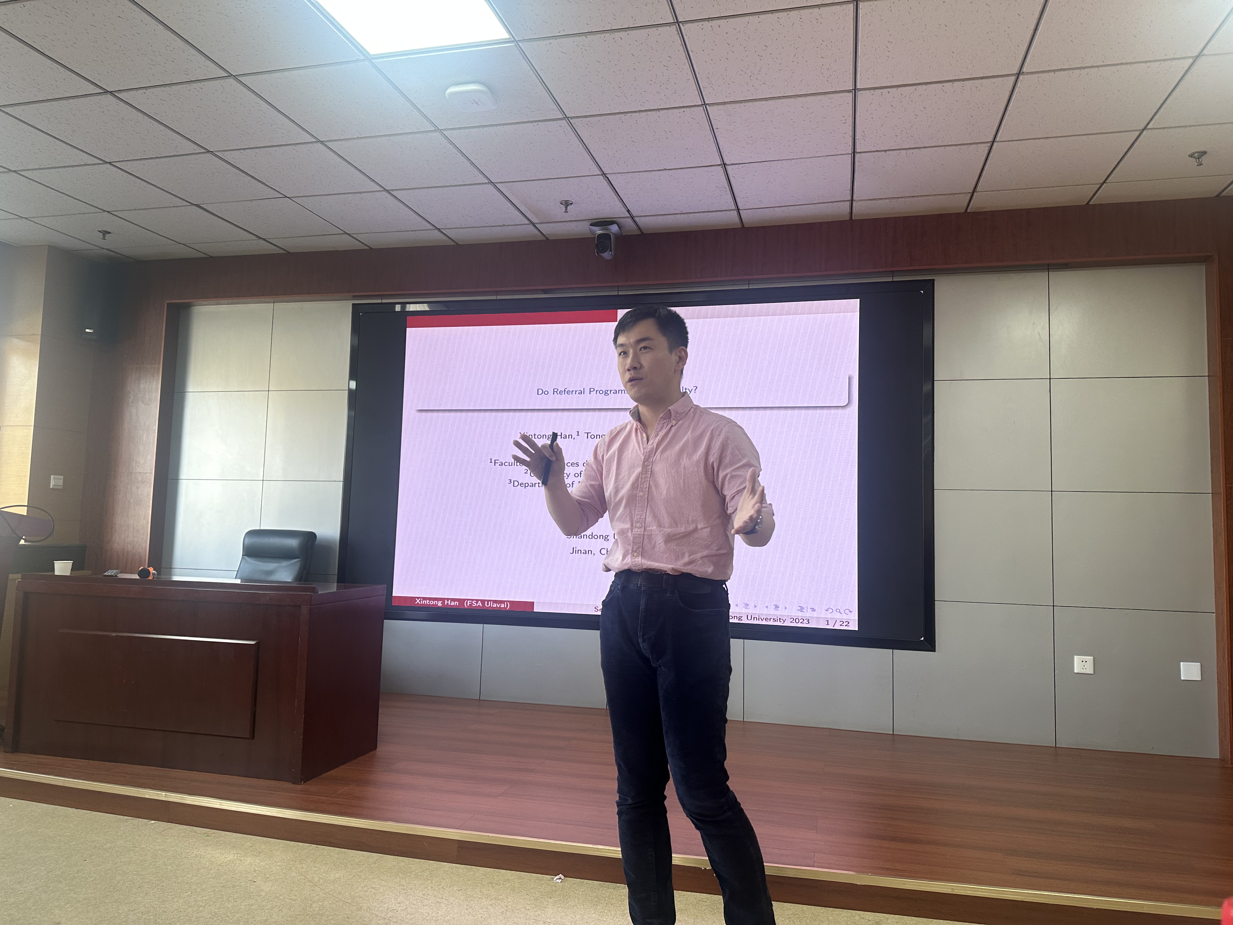 10月26日下午,必赢线路检测中心第一期“经济理论与政策前沿”讲座于中心校区知新楼B423聚贤报告厅举行,拉瓦尔大学商学院市场营销系助理教授韩信桐博士做了主题为“推荐计划能带来忠诚么?(Do Referral Programs Drive Loyalty?)”的报告,讲座由必赢线路检测中心张吉鹏教授主持,必赢线路检测中心经济系部分教师、数字经济特色班部分学生和必赢线路检测中心部分研究生参加了讲座。
