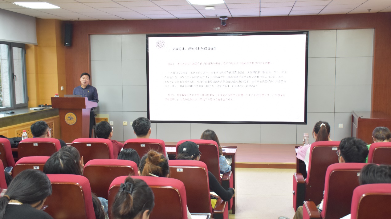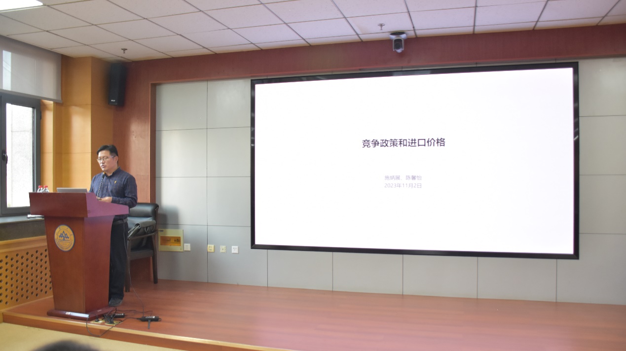 报告首先对党的十八大以来,我国积极主动扩大进口发展战略、降低进口价格和完善竞争政策的现实背景进行了解读。报告详细介绍了利用竞争法指数作为竞争政策代理变量的研究方法,使用跨国面板数据研究了竞争政策对进口产品价格的影响,并验证了理论推论和影响的作用机制。报告指出,该影响主要是通过减少国内企业进入固定成本、增加市场上企业数量,从而与外国出口企业形成竞争实现的。该研究的基本结论表明,通过国内竞争政策实施可以有效压制出口方议价能力,有效提升进口开放效益、保障经济安全。论坛最后,施炳展教授就模型变量选取、实证结果相关问题等与参会师生进行了深入探讨和交流。