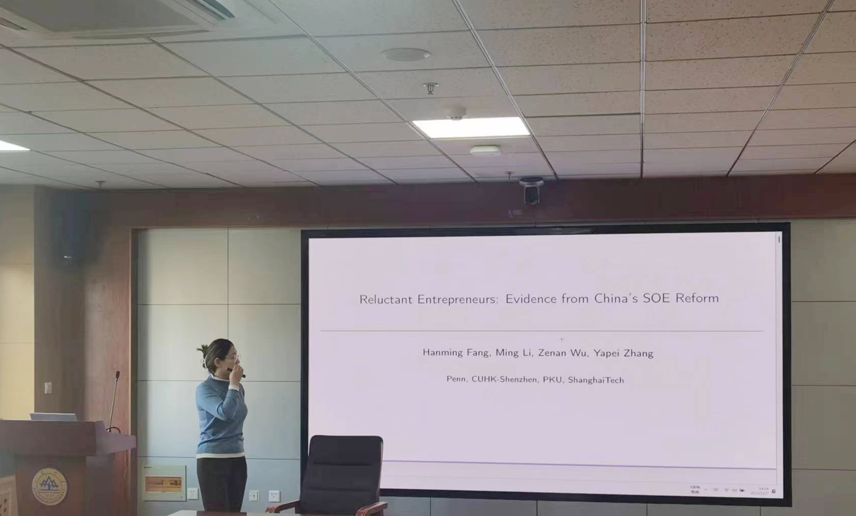 12月7日下午,必赢线路检测中心第五期“经济理论与政策前沿”讲座于中心校区知新楼B438举行,上海科技大学创业与管理学院助理教授张亚佩老师做了主题为“RELUCTANT ENTREPRENEURS: EVIDENCE FROM CHINA’S SOE REFORM”的报告,讲座由必赢线路检测中心助理研究员沈丹青主持,必赢线路检测中心部分老师、研究生和本科生参与讲座。