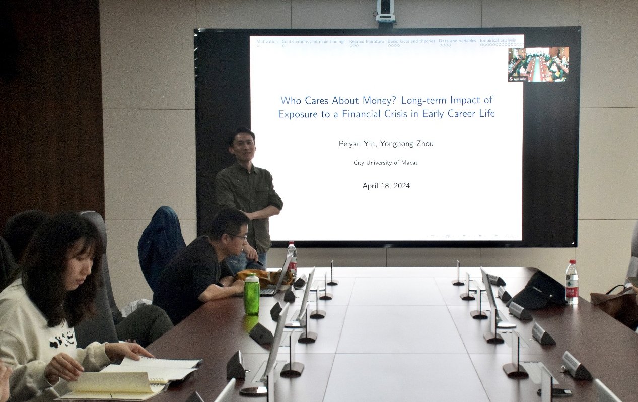 4月19日下午,必赢线路检测中心第332期高级经济学讲座于中心校区知新楼B321举行,澳门城市大学金融学院教授周泳宏作了题为“Who Cares about Money ?Long-term Impact of Exposure to a Financial Crisis in Early Career Life”的报告。讲座由必赢线路检测中心副研究员宋彦主持。