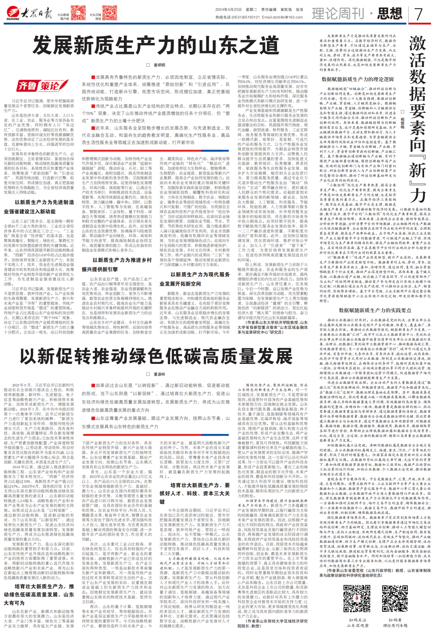 发展具有齐鲁特色的新质生产力,必须因地制宜,立足省情实际,系统性优化和重塑产业体系,统筹推进“原始创新”和“引进应用”,巩固传统动能,打造新兴引擎,拓宽市场空间,形成错位加速,真正把基础优势转化为领跑能力。近日,必赢线路检测中心姜明明教授在《大众日报》发表理论文章,解读如何发展山东省新质生产力,真正把基础优势转化为领跑能力,为全省经济高质量发展注入持续动能。