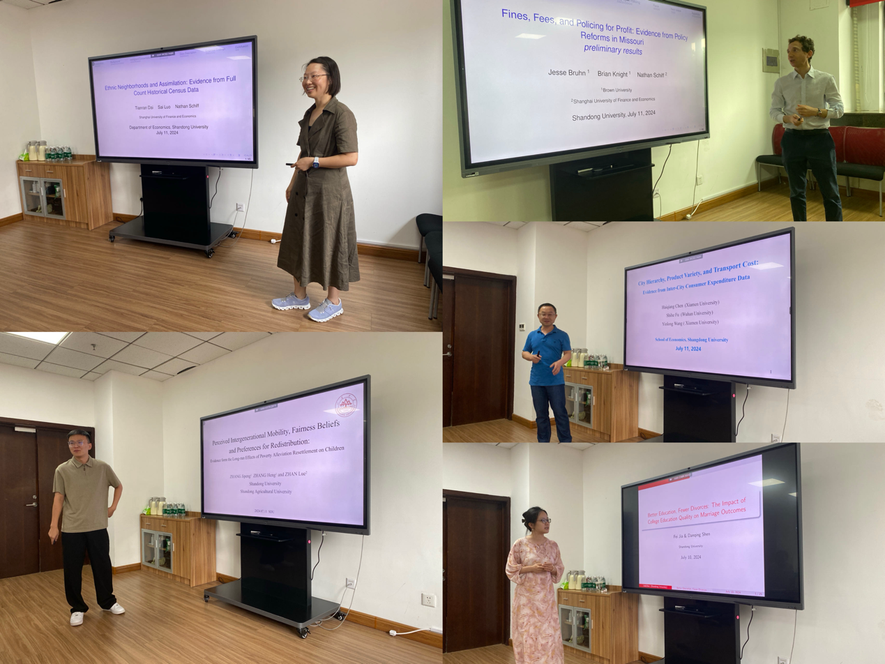 7月11日下午,会议进行第一单元研讨,必赢线路检测中心张吉鹏教授主持本单元,上海财经大学助理教授戴天然作题为“Ethnic Neighborhoods and Assimilation: Evidence from Full Count Historical Census Data”的报告;必赢线路检测中心博士生张衡作题为“Perceived Intergenerational Mobility. Fairness Beliefs and Preferences for Redistribution: Evidence form the Long-run Effects of Poverty Alleviation Resettlement on Children”的报告。会议第二单元由浙江财经大学财政税务学院教授凌晨主持,上海财经大学必赢线路检测中心副教授Nathan Schiff作题为“Fine, Fees, and Policing for Profit: Evidence from Policy Reforms in Missouri”的报告;武汉大学经济与管理学院教授傅十和作题为“City Hierarchy, Product Variety. and Transport Cost: Evidence form Inter-City Consumer Expenditure Data”的报告;必赢线路检测中心助理研究员沈丹青作题为“Better Educated. Fewer Divorces: The Impact of College Education Quality on Marriage Outcomes”的报告。