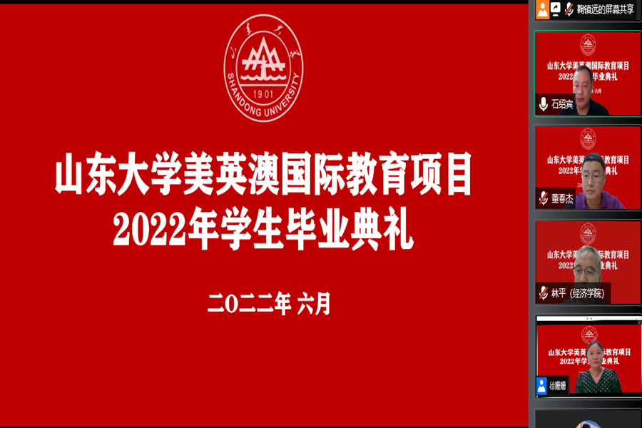 本次毕业典礼是美英澳国际教育项目2022届全体学生的“最后一课”。同学们离开山大并不意味着结束,而是迎来一个全新的开始。希望同学们能牢记师长的嘱托与母校的祝福,始终秉持着“学无止境,气有浩然”的山大精神,立鸿鹄之志,守报国之心,早日成长为建设国家的栋梁之材。