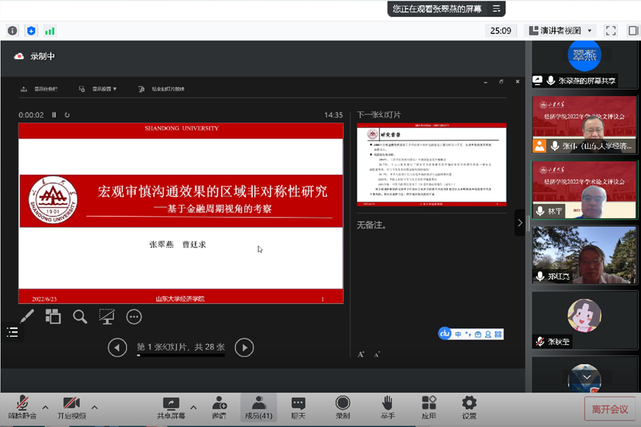 会议先后有五位学者开展汇报。首先,张翠燕作了题为《宏观审慎沟通的区域非对称性研究—基于金融周期视角的考察》的报告。相较货币政策沟通,宏观审慎沟通的研究十分不足,为弥补这一不足,本文采用监督学习的方法构建了宏观审慎沟通指标,并检验了宏观审慎沟通的中观效果,研究发现,宏观审慎沟通效果具有非对称性效应,而且宏观审慎沟通主要通过对区域间金融周期波动溢出联动进行逆周期调节达到熨平整体金融风险的效果。张亚男报告了论文《检疫隔离中的经济行为:社会偏好的挤出及其助推回归的自然实验研究》。鉴于目前尚缺乏检疫隔离对个体经济行为的影响研究,本文借助于外生事件,率先使用实验经济学方法探究并发现了检疫隔离对社会偏好的挤出效应,加深了对检疫隔离影响的理解,并警示评估隔离政策的文献应将这一影响纳入考虑。刘茵伟作了题为《打破“投机诅咒”:大市场的作用》的汇报,为探究建设全国统一大市场能否打破“投机诅咒”从而提高企业创新效率,本文采用2009-2019年沪深A股上市公司的相关数据,构建双重固定效应模型,验证了不同市场环境下投机行为对企业创新效率的不同影响。刘慧敏作了《竞争拐点、医疗质量与中国医疗产业竞争政策》的论文报告。为解决当前医疗需求和医疗资源的矛盾,论文以中国医疗产业竞争为切入点,研究医院竞争对医疗质量的影响,研究指出,随着医院竞争程度的提高,医疗质量呈现U型,目前中国医院竞争程度对医疗质量的影响临近拐点。论文给出建议,各地区应根据医院竞争程度施行相应竞争政策、区别化引导,同时深化医疗体制改革,真正落实分级诊疗制度。最后,刘铠豪作了《再分配政策对农村家庭消费的影响——来自税费体制改革的证据》的论文分享。基于农村税费体制改革这一准自然实验,从家庭消费的微观角度探究了再分配政策对家庭消费的影响作用。研究发现,农村税费体制改革过程中的“费改”和“税改”均促进了家庭消费支出的增长和家庭人均消费支出的增长,并促进了家庭消费结构升级。