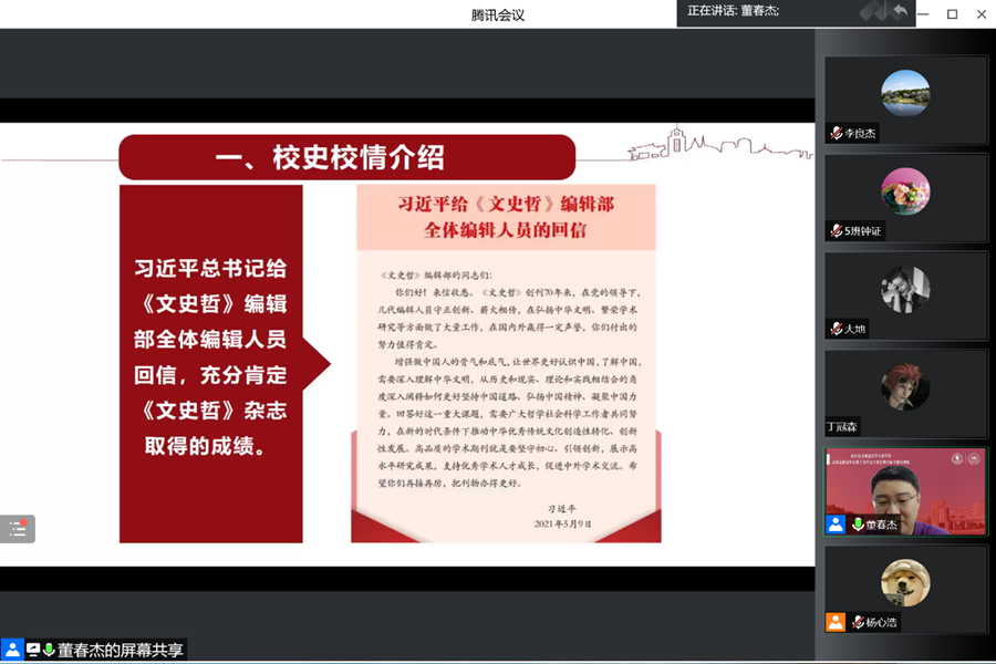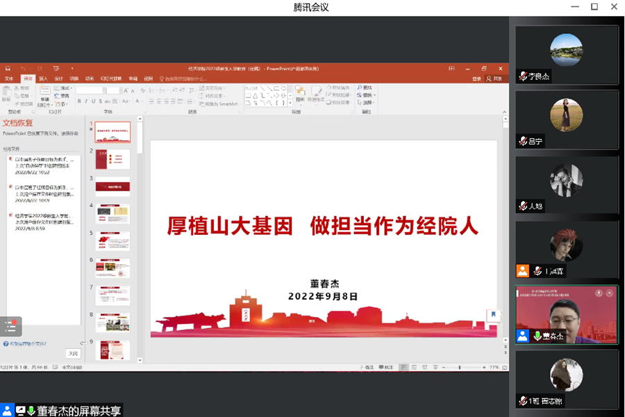 9月8日,必赢线路检测中心以线上方式开展2022级新生校史院情教育。学院党委书记董春杰为2022级全体本科生和研究生作了“厚植山大基因,做担当作为经院人”的专题讲座。讲座由党委副书记李良杰主持。