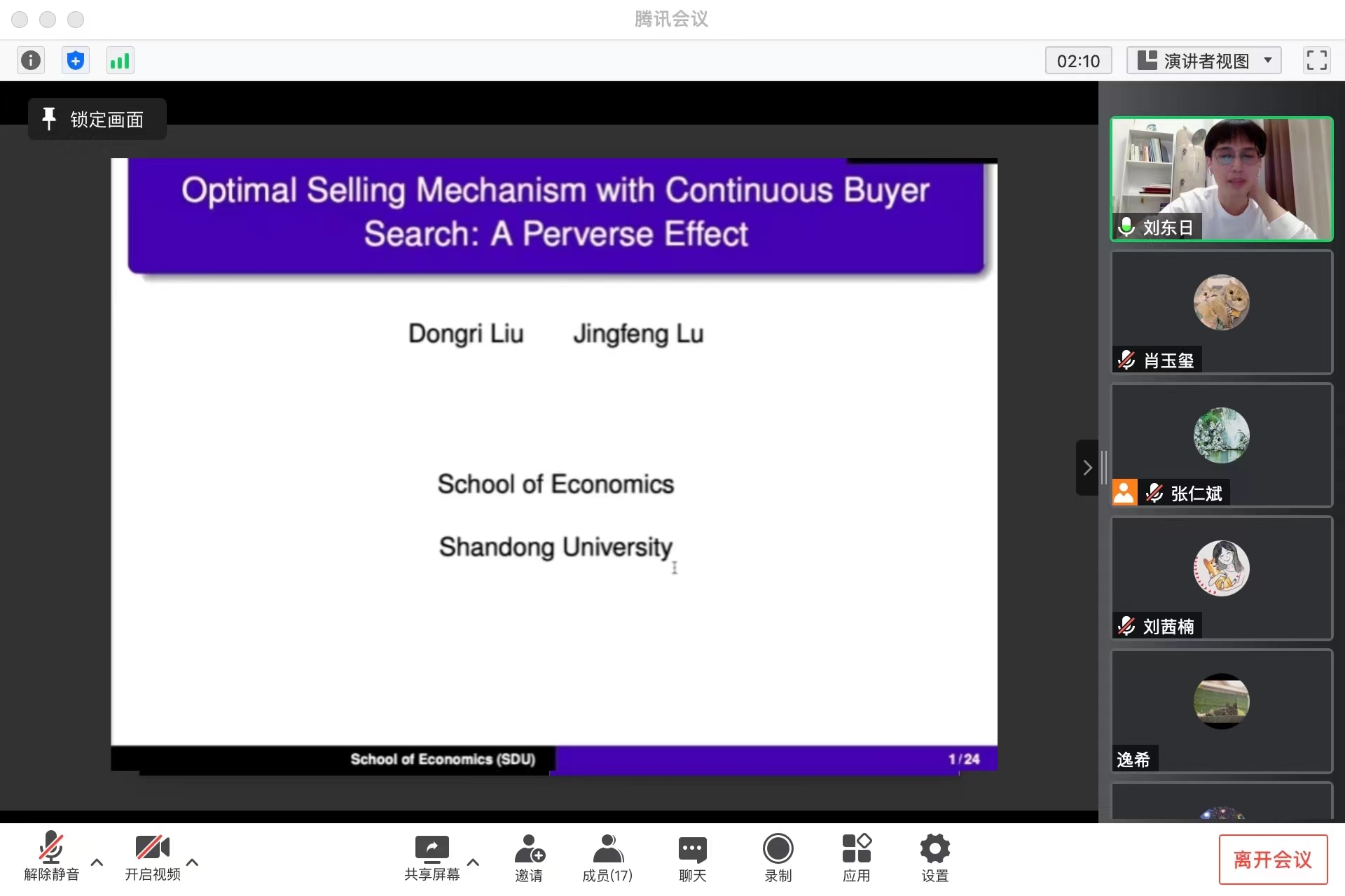 9月15日,必赢线路检测中心第71期青联学术午餐会以线上形式举行,新加坡国立大学经济学博士刘东日作了题为“Optimal Selling Mechanism with Continuous Buyer Search: A Perverse Effect“的学术报告。本次会议由必赢线路检测中心助理研究员张仁斌主持,学院部分师生参会。