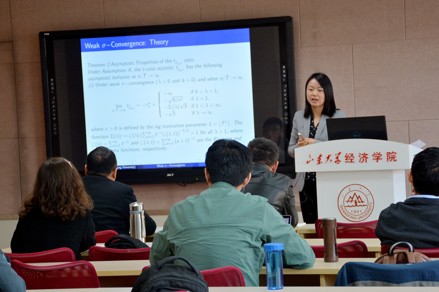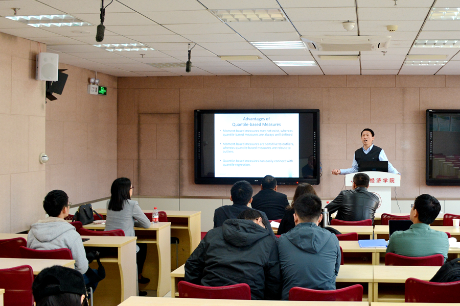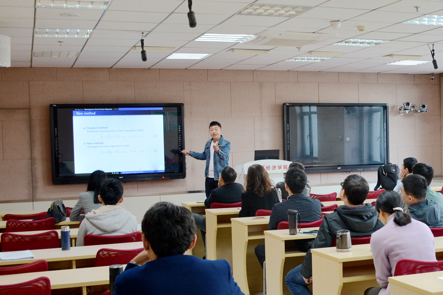 会上,陈强教授作了“分位数回归的拓展与应用”的研究报告,提出了基于分位数回归的“跨度回归”(Spread Regression)、“偏度回归”(Skewness Regression)与“峰度回归”(Kurtosis Regression)的概念与统计推断,并应用于美国人口普查的工资数据。另外,陈强教授也介绍了应用分位数回归,构造“回归控制法”(Regression Control Method,i.e. a panel data approach for program evaluation)的置信区间的研究进展。严晓东副教授作了以“回归模型的异质性分析”为题的专题演讲,讲述了多项在审或发表的研究工作。其中包括建立了异质性生存回归模型;提出了高维异质性数据的K回归方法;探讨了多数据集下高维数据的融合分析策略;分享了最近被A+期刊《Journal of the American Statistical Association 》接受的工作,文章提出了一个新的处理超高维异质性回归数据的特征筛选方法。孔建宁老师以“弱σ收敛的理论和应用”为题作了专题报告,通过对T-ratio的分类讨论,区分收敛和差异这两种不同的情况,同时以2008年经济危机和公共产品试验为例,介绍其在宏观数据分析和实验经济学中的应用。最后,点评嘉宾与报告人进行学术交流互动,并对研究报告就行了学术评议。