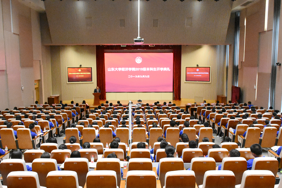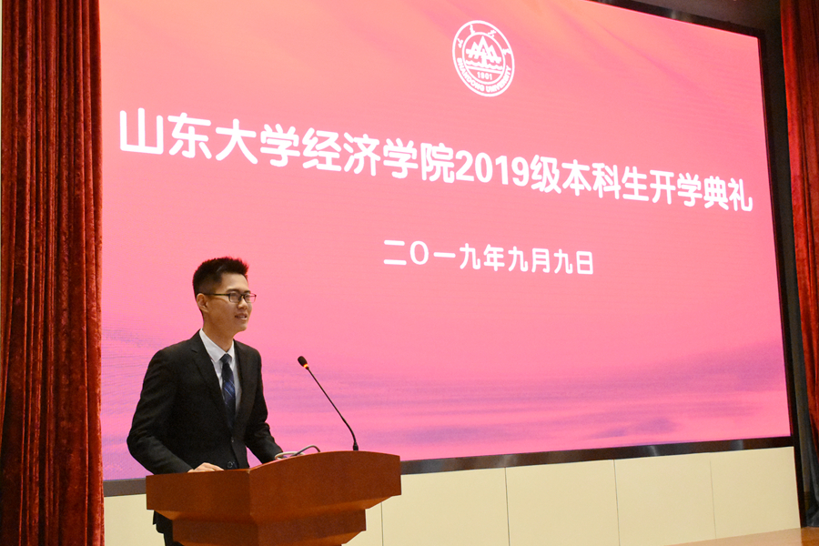 典礼在雄壮的国歌声中拉开帷幕,曹廷求在致辞中代表学院向全体本科新生表示欢迎,他围绕“经世济民,同心追梦”主题展开,他指出经院学子要立足中国,面向世界,胸怀经世济民理想。在全球治理体系发生深刻变化的当今世界,中国发展面临前所未有的机遇和挑战;中国经济发展研究的当务之急是把握时代经济发展规律,加速构建中国特色社会主义经济理论;作为新时代大学生,要有新担当,新作为,放眼长远,着眼未来,从中国特色、中国国情入手,推动中国理论革新,为中国经济发展作出贡献。他希望新生要选择奋斗,全面发展,把实现中华民族伟大复兴的中国梦、建设世界一流大学的山大梦、建设一流学院的经院梦、德智体美劳全面发展的个人梦有机结合起来,养浩然之气,求无境之学,涵养家国情怀,勇攀高峰,砥砺前行,为实现中国梦贡献青春力量。