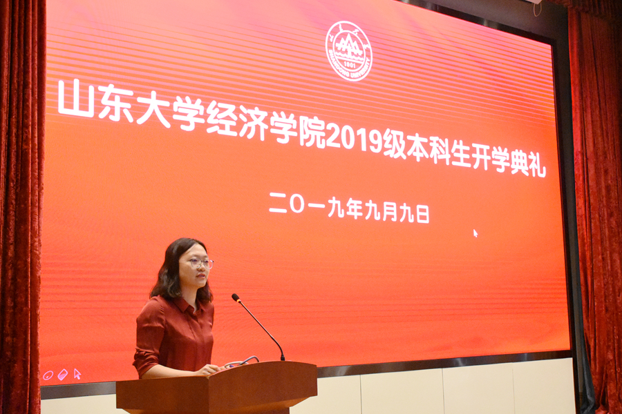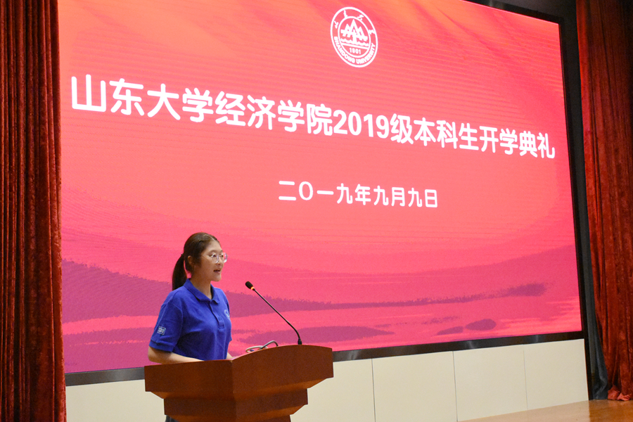 新生代表李兰月向在发言中表达了对山大和经院的感谢与敬意,饱含深情地讲述了自己与山大结缘的经历,号召新生们抖擞精神,不畏艰难,博学经邦,传承浩然之气;敦行济世,勇做栋梁之才。