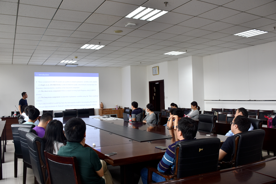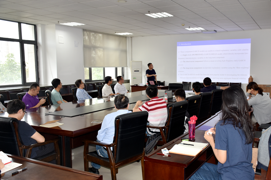 报告主要研究了如何将GARCH-MIDAS 模型与变量选择方法结合来预测股票市场的长期波动。首先,报告总结了股票市场长期波动已有文献的主要方法和缺陷,目前学术上比较流行的GARCH-MIDAS 模型多用于研究单变量对股票市场长期波动的影响,若把多个变量放在一个模型中估计,会产生高相关性且降低估计效率。为解决这个问题,报告在GARCH-MIDAS 模型的长期波动变量中考虑了大量的解释变量,并在GARCH-MIDAS模型的对数似然函数中引入了Zou(2006)提出的Adaptive-Lasso惩罚项,以达到变量选择的目的。然后,报告阐述了数据所用数据、模型设定、变量选择结果、后选择估计和样本外预测评估。通过变量选择,报告最终选取了四个变量(房屋开工、失业水平、期限价差和MKT),同时还发现实际GDP和工业产值的影响可能被高估。在样本外预测评价中,研究发现除了包含期限价差的模型,报告所建立的模型是优于其他模型的,同时指出期限价差是预测股票市场长期波动非常有力的变量。报告结束后,参会老师就报告的研究方法、数据选择及后续研究等有关问题与方彤老师进行了深入交流与探讨。