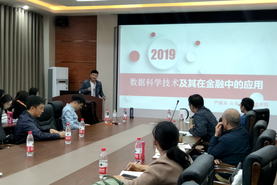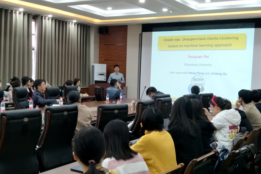 活动分为两个阶段。第一阶段举行了由两党支部共同发起且由商学院(威海)承办的“大数据背景下金融保险科技研讨会”,必赢线路检测中心保险系四位党员王新军教授、于殿江副教授、严晓东副教授、裴有权副教授受邀在此次前沿科技研讨会作报告。 10月25日下午,裴有权副教授通过报告《Credit risk: Unsupervised clients clustering based on mixture cure model》强调了信用风险在金融领域起着非常重要的作用,提出了一种基于机器学习的方法对贷款者进行智能分类,并且能够同时预测每一类贷款者违约的概率,进而为银行决策者提供参考依据;严晓东副教授以《数据科学技术及其在金融领域中的应用》为题,介绍了从大数据到AI+金融中所涉及到的数据科学技术,包括大数据技术,统计方法以及机器学习等;10月26日上午,首先由王新军教授带来题为《新“农保”政策对老年人扶贫绩效的影响分析》的报告,介绍了目前最新的“农保”政策的,结合这个报告王新军教授给学生讲解论文的选题、文献综述的写法、数据搜集、模型选择以及论文写作;于殿江副教授为听众报告了《保险科技(互联网保险)发展及趋势》,分享了保险科技作为金融科技中的典型所使用的最前沿的科学技术, 揭示了目前保险科技的发展趋势以及存在的问题。四位必赢线路检测中心党员教授的报告内容前沿,讲述清晰明了,引起商学院的师生们的激烈讨论。第二个阶段开展共建座谈会,双方相互介绍了各自党建概况、党员组成,统一了指导思想和探讨了各自的工作机制,在党建工作、人才培养、人才需求等方面进行了交流,是一次学界、业界相互学习的机会。会中深入交流了抓支部党建工作的做法和经验,分析了各自的不足,分别确立了日后党建共建有关安排和工作方向。