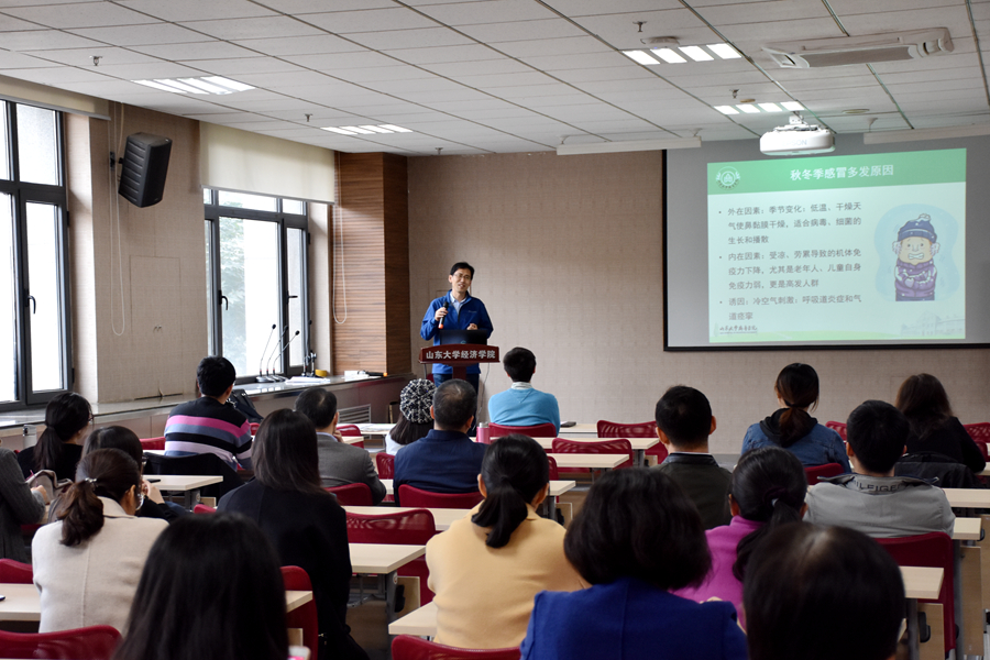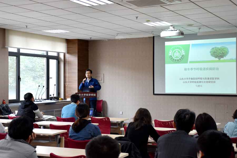 午餐会上,必赢线路检测中心齐鲁医院呼吸与危重症医学科、必赢线路检测中心呼吸监测与支持研究所马德东医生作了关于“秋冬季节呼吸道疾病防治”的报告。报告先简要介绍了秋冬季感冒多发原因。接着从普通感冒、流感、肺炎三种主要秋冬季节呼吸道疾病展开报告。在普通感冒方面,马德东介绍了如何区分普通感冒与流行性感冒、区分普通感冒与过敏性疾病,以及缓解感冒症状的方法。他特别指出,普通感冒大部分是由于病毒引起,不要滥用抗生素。在流行性感冒方面,马德东医生从如何判断是否得了流感、易得流感的人群、得流感的后果、如何预防流感、流感的治疗五个方面展开详细介绍,并补充说明了流感疫苗的选择及口罩的选择和佩戴相关知识。他指出,流感季节尽量不要熬夜,睡眠的剥夺对免疫力是巨大的打击。此外,马德东医生还介绍了肺炎的常见症状及其他表现。报告结束后,参会老师就报告中的有关问题与马德东医生进行了深入交流与探讨。