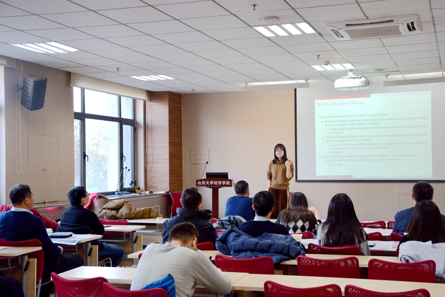 报告首先介绍了美国青少年劳动力市场的就业情况以及研究现状,随后介绍了NPND(No Pass No Drive)政策,该政策通过吊销旷课青少年学生的驾驶证以提高学生的入学率。而报告旨在研究该政策对于青少年劳动力市场的影响,特别是对于不同种族和年龄青少年影响的差别。报告选取1988年至2014年美国青少年劳动力市场的数据,采用双重差分估计这一影响并控制了政策、家庭收入、整体失业率等变量。研究结果发现,使用该数据能够验证NPND的确提高了学生的入学率的假设,而15至17岁黑人青少年兼职就业率上升是由于这些岗位是从18到25岁白人青年那里得来,即这一政策降低了美国不同种族之间的就业不平等程度。今后,报告的研究方向将从劳动力供给与需求两方面对这一原因做进一步的分析。报告结束后,参会老师就报告中的有关问题与沈丹青老师进行了深入交流与探讨。