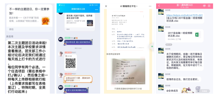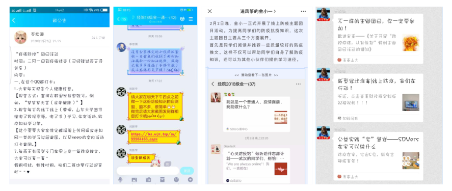 加强宣传,引导线上学习。必赢线路检测中心各团支部及时、有效传达有关防疫文件精神和学校防控要求,积极做好宣传工作,通过QQ群、微信群转发官方信息,营造良好的防疫宣传氛围,引导同学做好防控工作,保证自身健康安全;组织学习疫情相关知识、了解防控办法,引导学生客观认识疫情,科学预防疫情,冷静应对疫情,不信谣,不传谣,稳妥做好疫情防控的舆论引导工作,为疫情防控阻击战打牢舆论基础;学院各团支部依托班群、公众号、朋友圈等平台,进行形式多样、内容丰富的网络助力,扩大宣传范围,传递爱与温暖,展现了青年生力军为打赢这场战役奉献的力量。2017级金融一班团支部每日持续关注肺炎疫情实时动态,及时在班级里转发疫情快讯,聆听权威声音,阅读战疫日记;2018级金融二班团支部利用问卷星进行防疫知识自测,查缺补漏,更好地了解疫情、抗疫防疫;2018级经济班团支部组织疫情新闻直播收看及学习;2018级金融工程班观看科普视频,对新冠病毒有了全面的认识;2019级五班团支部组织同学在班级群里以语音和文字的方式交流,讨论疫情现状并学习防护措施。