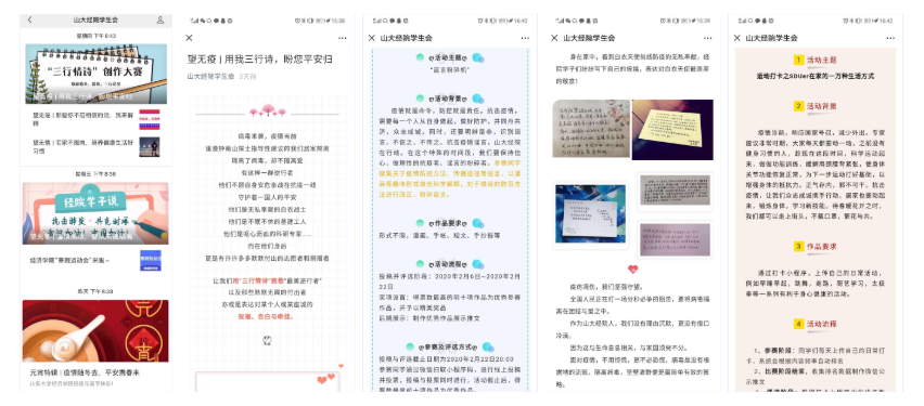 活动推广,丰富假期生活。为丰富学生的居家生活,必赢线路检测中心各学生组织将开展系列活动,包括创作三行诗致敬“最美逆行者”、“谣言粉碎机”、“培养健康生活好习惯,健身打卡”“寒假运动会”等活动鼓励同学为疫情防控做出贡献,度过更有意义的假期生活。