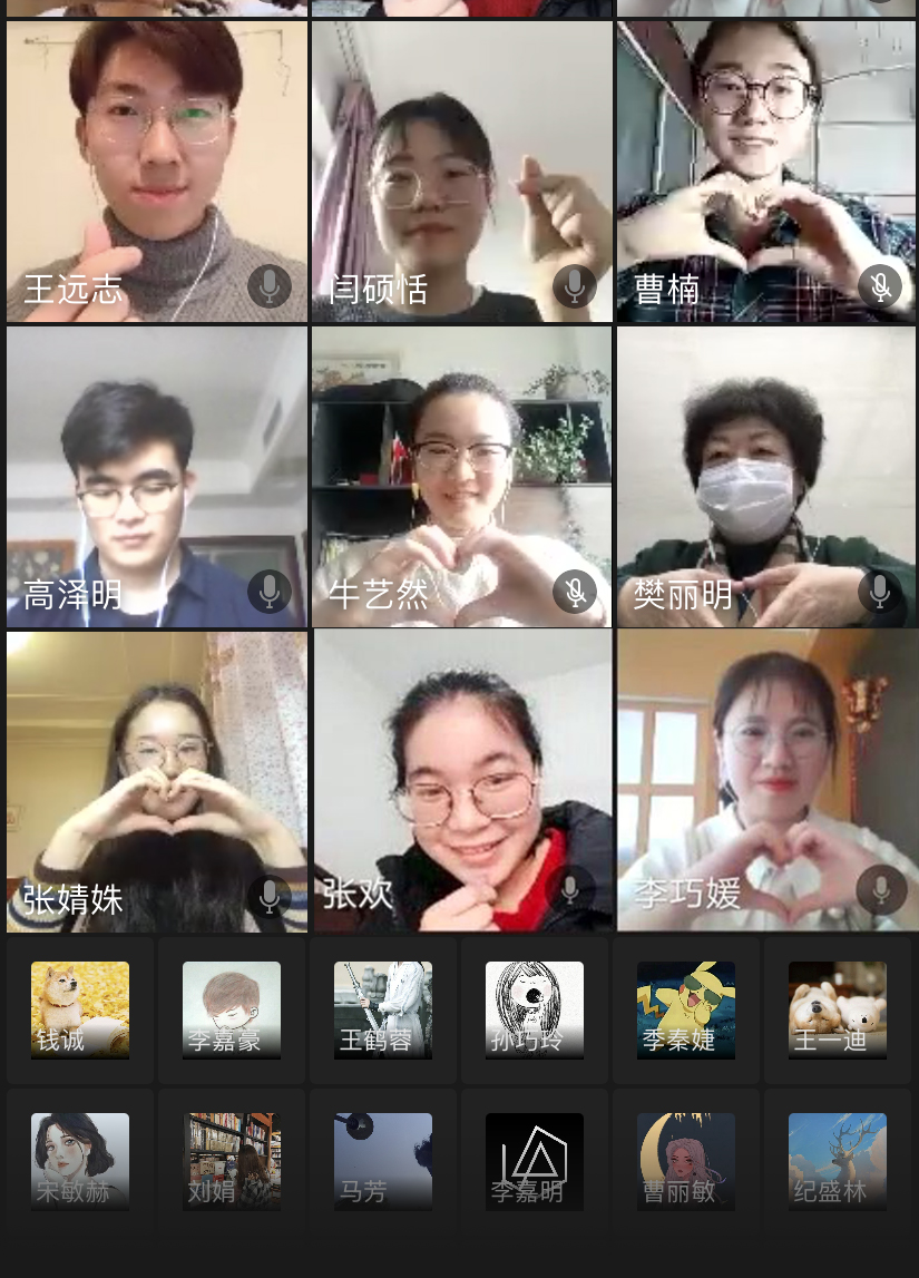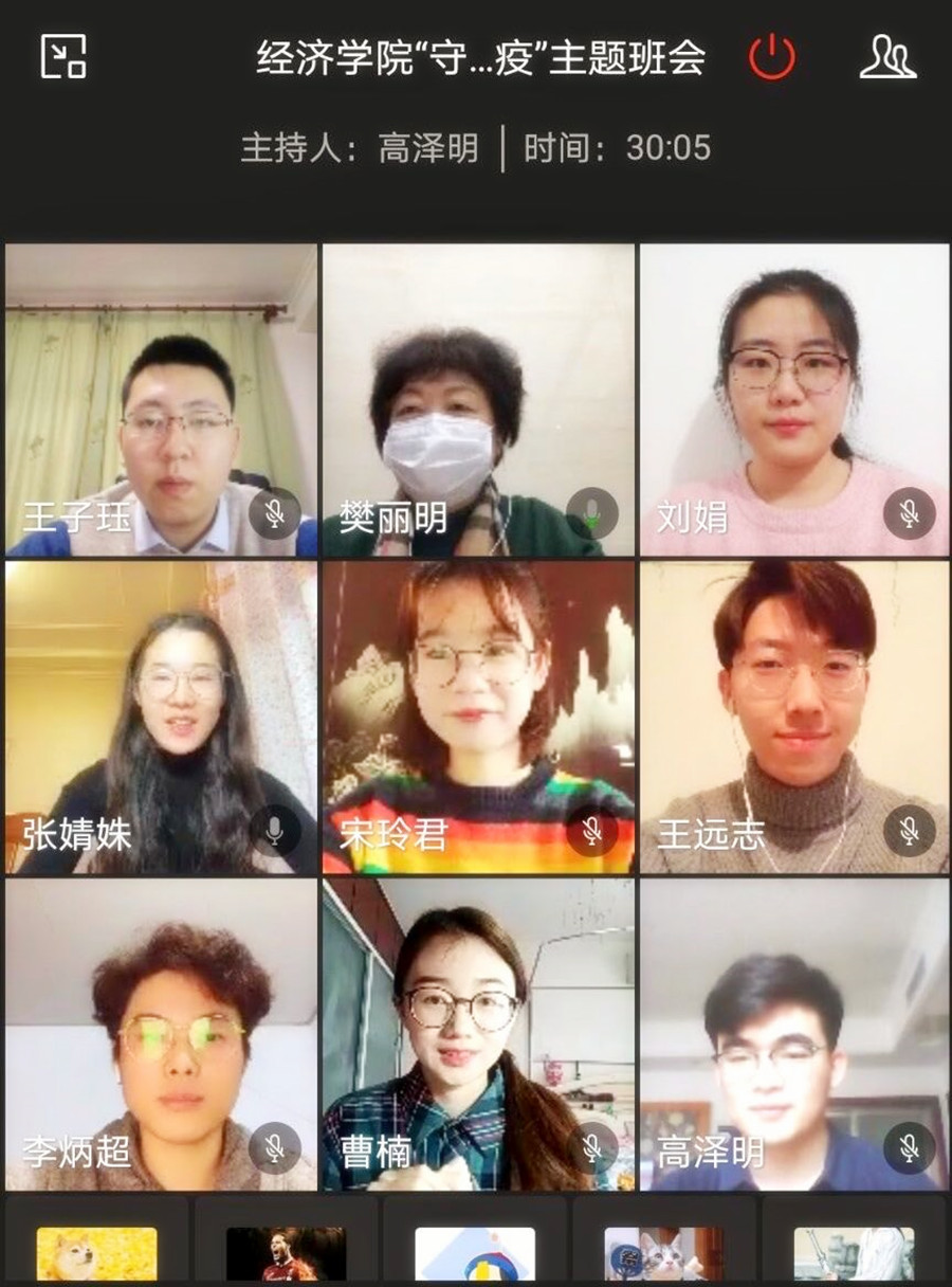 活动伊始,主持人带领班级同学回顾了在疫情面前全国上下同心同向同行,在党中央的坚强领导下,用中国力量创造中国奇迹的战疫之路,并连线来自不同省市的同学代表,分享疫情期间的所行所思所感。深受大家关心的家在湖北省的盛祺豫首先分享了自己在疫情期间的生活情况,并表示近况已经越来越好,同时感谢来自老师和同学们的鼓励与祝福;班长高泽明回顾了班级内的战“疫”行动-捐款活动;体育委员李嘉明号召同学们参与学院举办的“线上运动会”,积极开展居家运动,强身健体;担任线性代数助教工作的李炳超介绍了老师们线上教学情况;牛艺然分享了自己的新学期学习计划,表达了对同学们的想念与重回校园的期待;许慧媛分享居家学习近况以及家乡防疫采取的措施;张欢结合自身曾在汶川地震时受到援助的特殊经历,抒发“爱心是循环的”感悟,在疫情爆发的今天,她认为理所应当贡献出自己的一份力量。同学们的发言生动而真挚,樊丽明不时与同学互动交流,从居家生活、线上学习、体育锻炼、物资保障等方面关切同学现状。