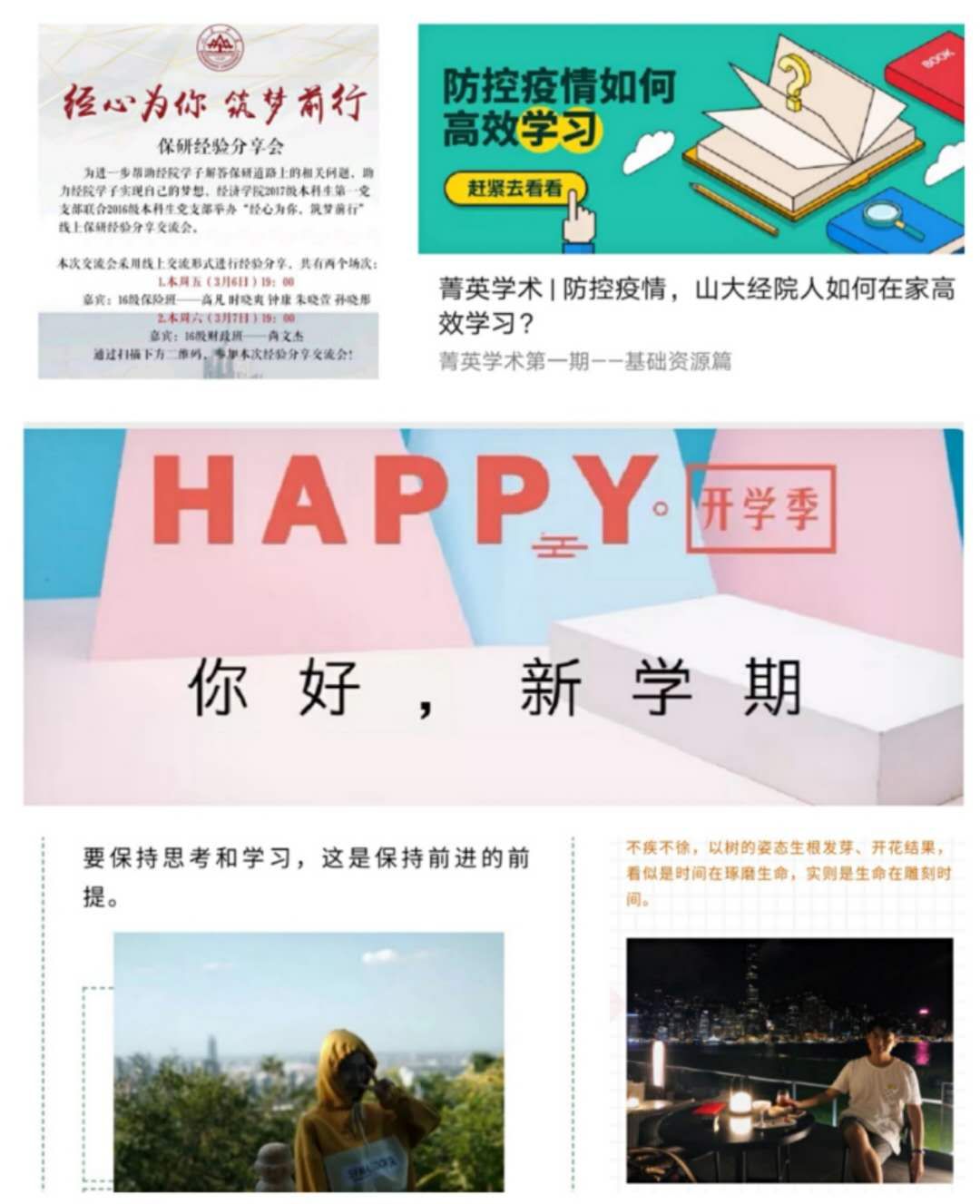 疫在攻克,学正当时。为积极响应教育部提出的“延期不延学,停课不停教”的号召,学生会、新闻中心、青年志愿者协会统一协调,坚持抗疫与暖心并举、防疫与育人结合,齐心打造学生战“疫”新阵地。三部门联合推出“青春网上团课”与“经院菁英”精品活动,发挥经院菁英模范带头作用,以优秀学子的亲身经历鼓励大家居家高效学习,切实提高自身学术水平;为帮助大家尽快适应网上教学模式,学生会各部门推出“开学季”系列推文,既吹响了学习冲锋的号角,又为同学们提供护眼、护颈椎等暖心的上课小贴士,营造了浓厚友爱的学习氛围。