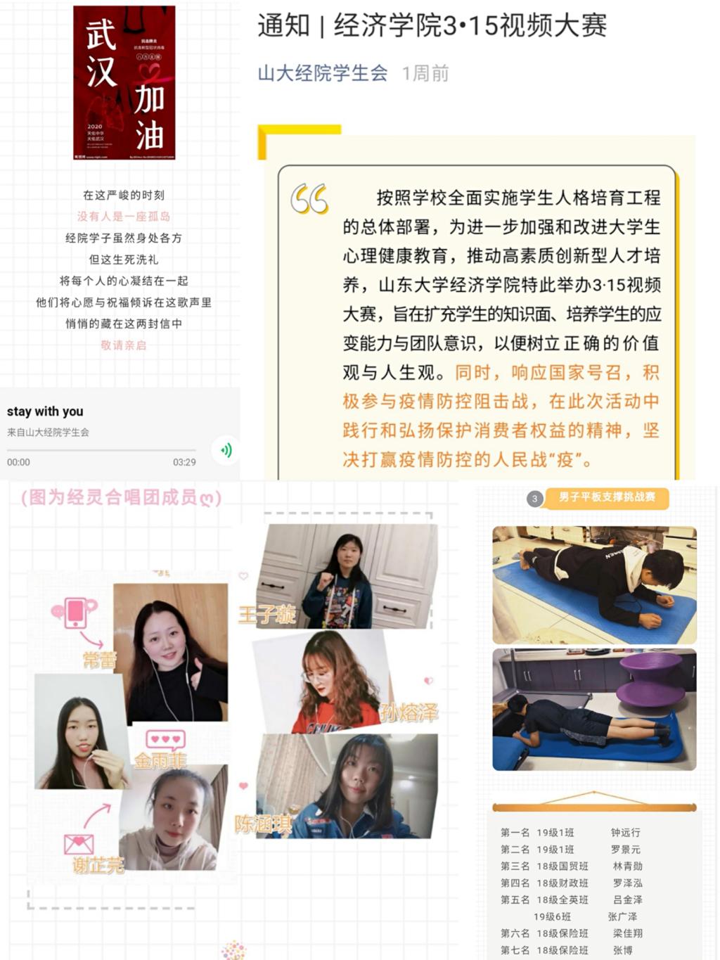 学生组织开展多项文体活动,鼓励同学们居家不忘德智体美劳全面发展、做具备综合素养的新时代青年。四院联动,发现山大青年宅家生活的丰富多彩;八院联合,聆听经院学子动人心弦的爱国之声;思维物化,学术部举办文化创意大赛,展现学院文化底蕴、艺术风采、创新精神,更以多样化创意形式为疫情防控贡献了一份经院力量;为弥补无法返校开展春季运动会的遗憾,体育部推出寒假线上运动会,通过一分钟大赛、坚持打卡等形式引导学生培育健康生活方式、增强身体素质,为疫情防控筑起更为坚固的体质高墙。在学校领导及院会组织下,通过学院线上引导、学生线下实践的方式有序实现了提升综合素质的教学培养计划,学生亦收获了一段丰富难忘的居家时光。