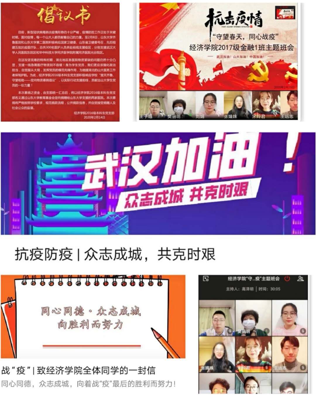 疫情期间,各组织积极打造线上战“疫”思政平台,打牢防疫舆论宣传基础。党员先锋做表率,筑堡垒。必赢线路检测中心各党支部举办主题党日活动,支部成员踊跃参与,募集善款援助武汉;学生组织协助班级开展系列主题团日与同上“爱国主义必修课”班主任线上主题班会活动,及时掌握学生居家期间的思想动态,强化思想引导,凝聚思想共识,鼓励学生同心抗疫,强思健学,打好学生阵地防疫思想基础;必赢线路检测中心全体同学共读“一封信”,共上思政课,将感动和震撼转化为支持防疫斗争的强大力量,体现了当代大学生听党指挥、爱国奉献的家国情怀和经院人的济世担当;新闻中心推出战“疫”系列推文,畅通信息,强化宣传,稳妥做好舆情宣传引导工作。