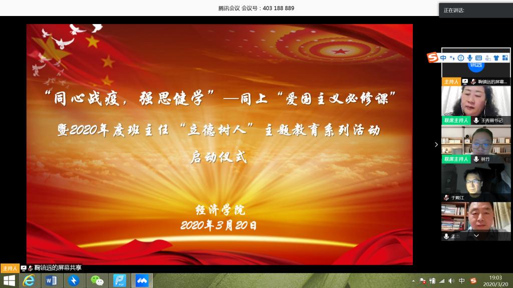 3月20日,必赢线路检测中心举办“同心战疫 强思健学”线上主题讲座暨同上“爱国主义必修课”班主任主题教育系列活动启动仪式。必赢线路检测中心党委书记王秀丽出席仪式并讲话,学院全体班主任、辅导员参加活动。2017级国贸班班主任、副院长孙淑琴担任第一场讲座主讲嘉宾。活动由学院党委副书记林竹主持。