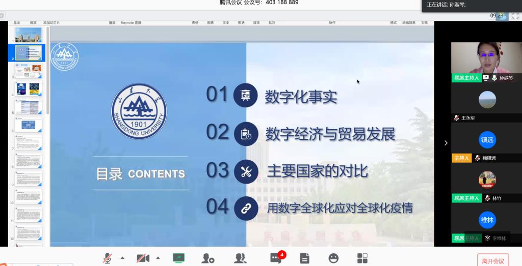 讲座环节,孙淑琴紧紧围绕“数字化事实”“数字经济与贸易发展”“主要国家对比”“用数字全球化应对全球化疫情”四方面内容,为学生深度剖析疫情中的数字经济与贸易发展。报告从几张图片和几则相关的新闻引出主题,由浅入深,明确数字经济的定义,分析数字经济的主要特征,指出“数字经济扩张的驱动因素包含数字数据和数字平台”“数字经济的价值难以衡量”“从地理上看,数字经济的发展极不平衡”等经济发展现状。紧接着,报告通过对中美欧日韩等多个经济体的相关数据进行对比,分析了全球电子商务的新兴态势,尤其是中国的电子商务在当今时代呈现出了极大的潜力。在此主题中,报告着重探究中国电子商务发展,总结得出,中国的电子商务具有创新驱动保障市场快速增长、全球品牌加强双向互动等特点,令同学们对于中国的电子商务有了更加深刻的认识。此外,基于以上内容,报告给出了几个研究课题的方向,对于学生今后理论方面和实证方面的科研提供一定参考。在互动答疑环节,面对同学提出的数据获取问题,孙淑琴介绍了自己在查找数据和查阅文献时的困难,并分享了一些获取数据的平台和途径,为同学们提供了宝贵的建议。最后,孙淑琴特别强调,在学习过程中要将经济学与数学、计算机等学科结合,在智能新经济的潮流中培养自己成为多学科交叉的复合型人才,掌握主动权。