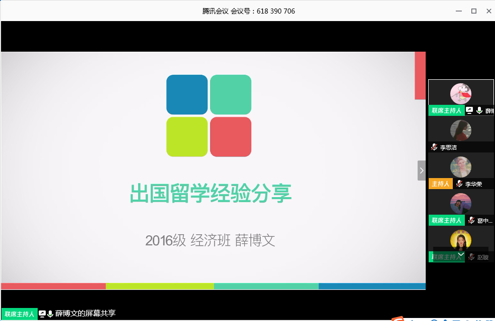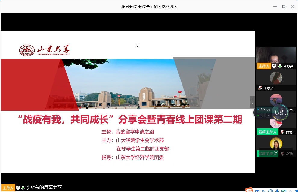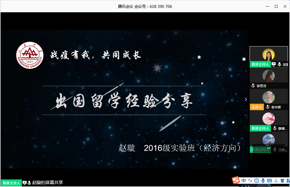 3月22日晚7时,山大在鄂学生第二临时团支部与必赢线路检测中心学生会联合主办的“战疫有我,共同成长”分享会暨青春线上团课第二期在腾讯会议举行。本期分享会主题为“我的留学申请之路”,会议邀请到了在2019 FAll申请季中获得多所世界名校offer的四位2016级经院优秀学子——葛中豪、薛博文、赵璇、汪路嘉等四名同学,在疫情居家期间为同学们的留学规划之路指点迷津、解疑答惑。