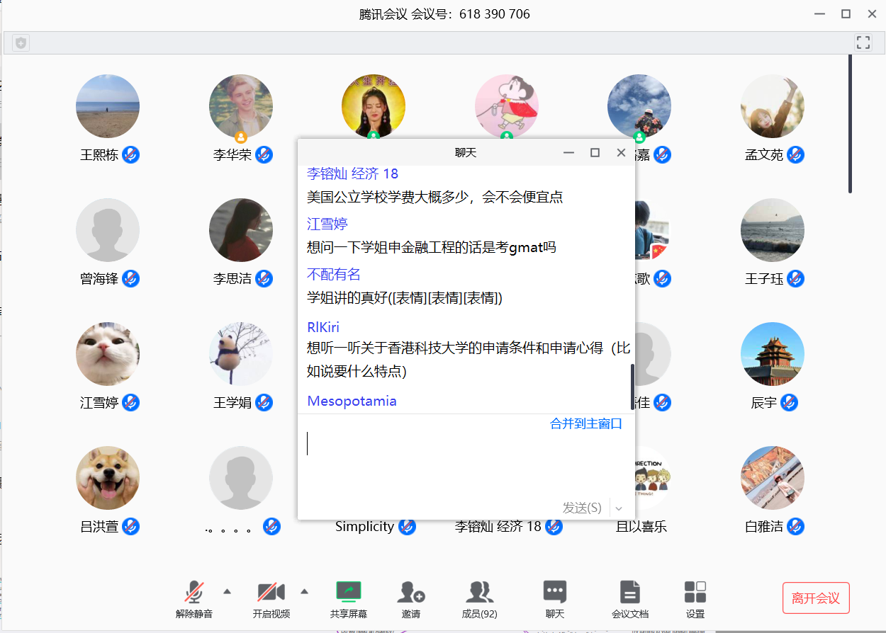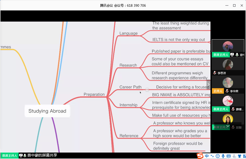 分享环节,第一位分享嘉宾葛中豪已收到Edin、Ambs与Wbs MSc Fiance的offer。他以思维导图的形式向大家介绍了英国留学的相关问题,内容涉及留学动机、费用、准备、咨询机构、择校、Gmat学习六个方面。在分享过程中,葛中豪尤其强调绩点在申请英国学校时的重要性;他也谈到咨询中介在留学申请道路中应当扮演的角色——Employee而非Employer。在Q&A环节葛中豪针对海外经历的重要性、读博考虑对申请英硕的影响以及如何找到有认可度的实习进行了简要回答。葛中豪的分享思路清晰、内容全面,令同学们收获颇丰。第二位分享嘉宾薛博文目前已收到Columbia University、University of Chicago等美国高校的offer。她详尽分享了自己留美的申请经验,侧重介绍了相关留学项目与申请流程。薛博文同样认为绩点是留学申请中的首要决定性因素,她分析了书写个人陈述时申请偏学术与偏就业的项目的不同,鼓励同学们在大二大三暑期积极寻找机会丰富自己的实习经历,推荐大家关注寄托天下、一亩三分地与Chase Dream等优质留学信息平台。在Q&A环节,薛博文主要向同学们分享了GRE的学习经验与香港地区的申请心得。薛博文的介绍向同学们展示了留美与留英申请方面的不同,为同学们的择校提供了丰富而有效的帮助。在英美留学部分分享结束后,已获得Duke、CEMFI与Bocconi等高校offer的赵璇向大家介绍了欧洲大陆的留学心得。曾在荷兰马斯特里赫特大学有过一学期交流经历的她对欧洲悠闲的生活节奏与较高的幸福感指数感触颇深,因而坚定了赴欧陆留学的信心。她从背景、准备与项目三个方面为大家讲解欧陆留学的相关问题,介绍了欧洲大陆相关学校的直博情况,并谈到不同层次的导师、不同类别的推荐信对留学申请所带来的不同意义。Q&A环节中,赵璇向大家介绍了小众商校的信息获取渠道、未来国内政府就业规划对项目选择的影响以及欧陆学校相对英美在申请方面的区别与难度上的差异。第四位分享嘉宾汪路嘉已获得UCB_IEOR、WUSTL_BA、BU_MSMF的offer。他主要向大家讲解了金融工程学科在美国的申请情况。学习方面,他分享了自己在数学学院的选修内容与在网上学习计算机的经验,强调计算机的实习实践比理论学习更加重要。关于推荐信,汪路嘉谈到同时拿到学校导师与实习导师的必要性。在Q&A环节,汪路嘉针对同学们的问题,为大家解答了申请美国金融工程项目对GPA的相关要求、如何丰富实习经历、实习中关于公司知名度与专业对口的之间选择等问题,为会议划上了圆满的句号。此次会议邀请的四位经院优秀学子从英、美、欧陆三个不同地区向同学们全面地讲解了留学申请之路的全过程,令同学们明白漫长而不懈的努力终会结出美好的果实,为同学们疫情期间的居家学习给予了帮助与鼓励,也让同学们对自己未来的发展方向有了更好的规划。