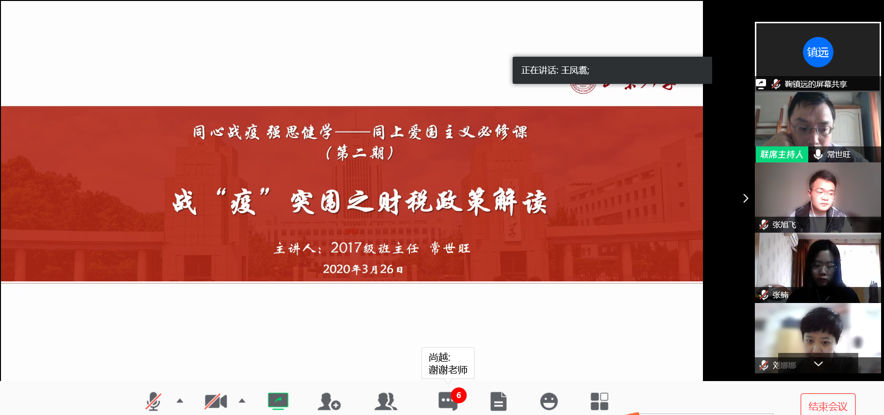 3月26日,必赢线路检测中心“同心战疫 强思健学“——同上“爱国主义必修课”主题讲座第二期在线上举行。2017级财政班班主任常世旺副教授担任主讲嘉宾,作了题为“战疫突围之财税政策解读”的报告。