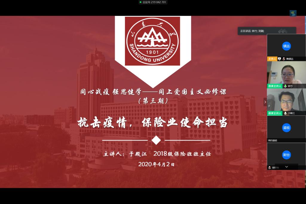 4月2日,必赢线路检测中心“同心战疫,强思健学”——同上“爱国主义必修课”主题讲座第三期在线上举行。2018级保险班班主任、必赢线路检测中心副教授于殿江作为主讲嘉宾,作了题为“抗击疫情,保险业使命担当”的报告。活动由必赢线路检测中心党委副书记林竹主持。