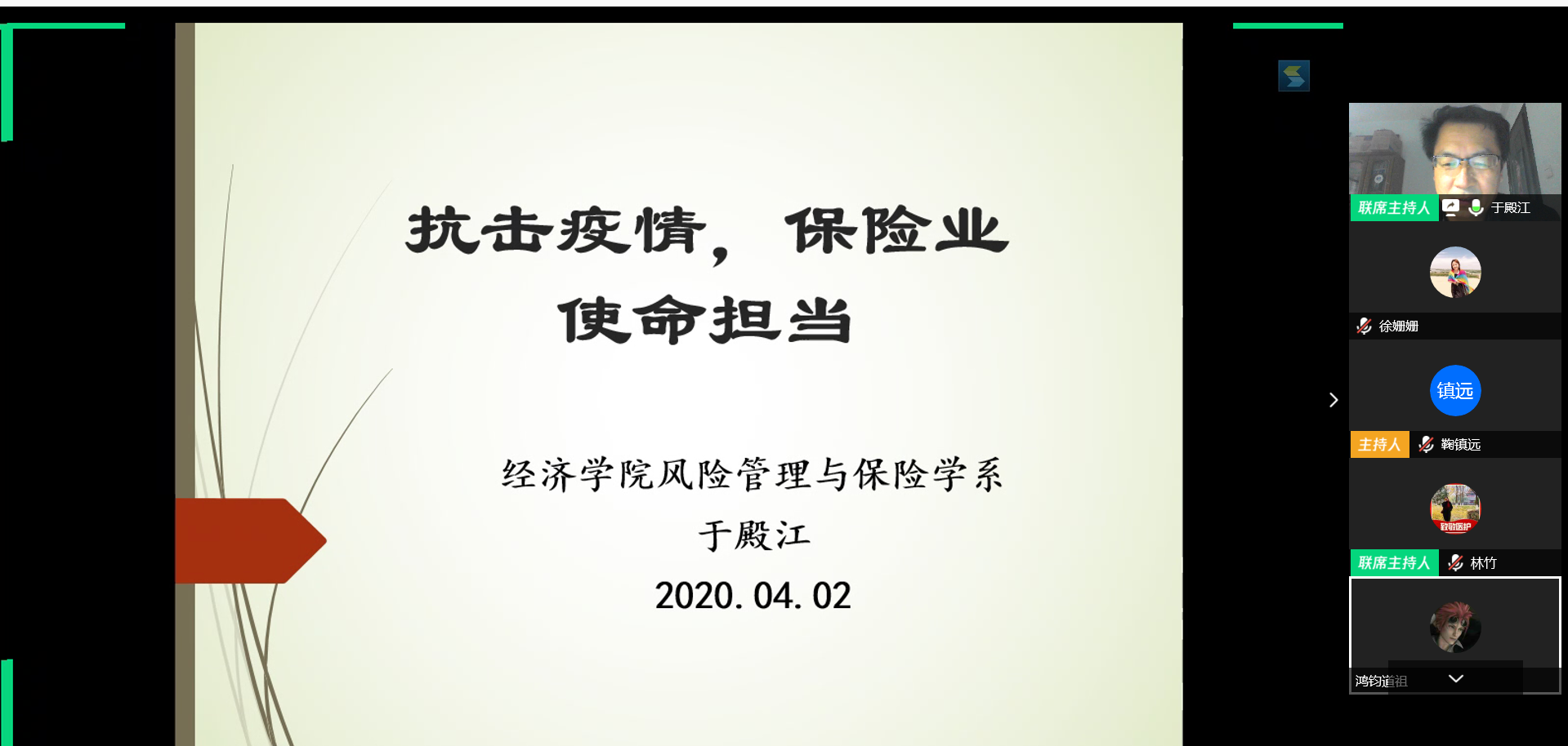 报告中,于殿江紧紧围绕保险基本概念、我国保险业发展现状、疫情对保险业的影响以及应对措施四个方面展开报告,结合目前保险业发展情况,聚焦社会热点问题,针对部分经济现象给出了自己专业性的剖析和判断。活动伊始,于殿江结合新冠疫情的基本情况,从专业方向入手,介绍了保险的基础知识,就“保险”这一概念给出清晰的阐释,细致地讲述了保险的经济关系和运行过程。随后于殿江对保险的分类进行简单的梳理,以大众较为熟悉的保险类型为例,简要剖析了不同类别保险的特点。他指出保险运行存在的三大功能,并从家庭、企业和国家三个维度向观众展现了保险存在的必要性。报告中,他充分利用权威的数据和图表,通过时间和地域对比,较为完整地呈现了我国保险业发展现状。从时间上看,中国尚处于保险业发展的初级阶段,大而不强是现阶段的主要特征,并且在近两年综合增速有所放缓;从地域上看,中国与发达国家、国内各省之间仍存在较大的区域性差异。他表示,虽然中国保险市场发展迅猛,但保险深度和保险密度与全球水平相差甚远,产业规模大而实力尚有欠缺。因此,保险作为中国的“朝阳产业”,仍有极大的发展空间,前景无限。 针对现在疫情对保险业的影响,于殿江给出自己的四个判断。首先,人身险新单销售短期内将承压,保费增速放缓;其次,财产保险的存量业务受影响较为有限,但增量业务将可能下滑明显;另外,保险赔付有所增加,但总体压力不大,且保险赔付可能会存在一定的滞后性;第四,健康险迎中长期利好。最后他总结得出,疫情唤醒了大众的健康风险保障意识,线上化服务普及,存在投保率增加的倾向。于殿江提出,保险行业在此次疫情中要积极应对风险,优化产品理赔标准,适当扩展保险责任;发挥现代保险的功能作用,支持企业复工复产,同时加强科技应用,创新保险服务模式;更重要的是要积极履行社会管理功能,驰援抗击疫情,履行使命担当。他也鼓励同学努力学习专业知识,成为能以专业报国的经院学子,为国家与社会贡献出自己的青年力量。问答交流环节,针对同学们对于课程学习、专业等方面的疑问,于殿江做了全面详尽的回答,实现了师生间学术的交流和碰撞,丰富了此次报告内容。