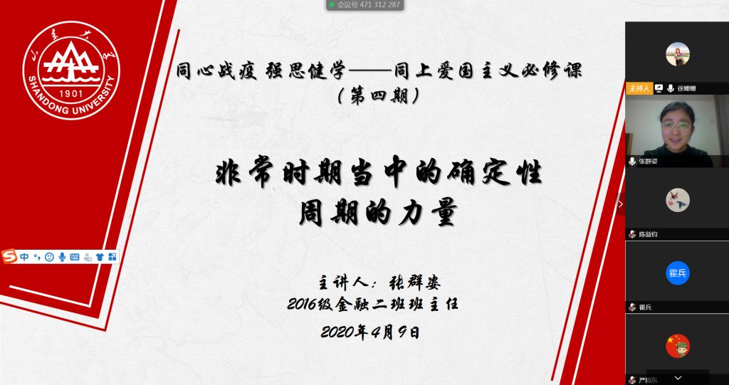 4月9日,必赢线路检测中心“同心战疫,强思健学” ”——同上“爱国主义必修课”班主任主题讲座第四期在线上举行。2016级金融二班班主任、必赢线路检测中心教授张群姿作为主讲嘉宾,作了题为“非常时期当中的确定性:周期的力量”的报告。