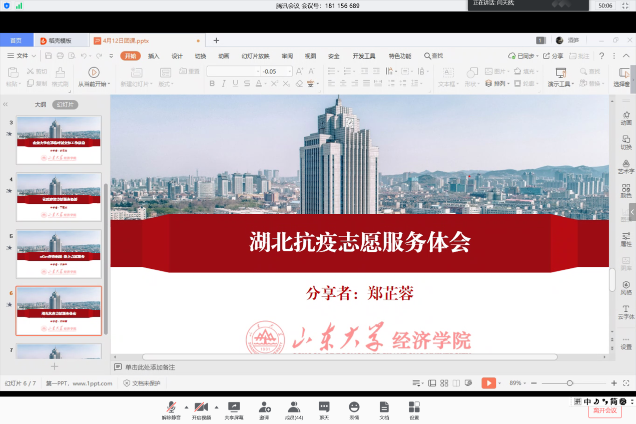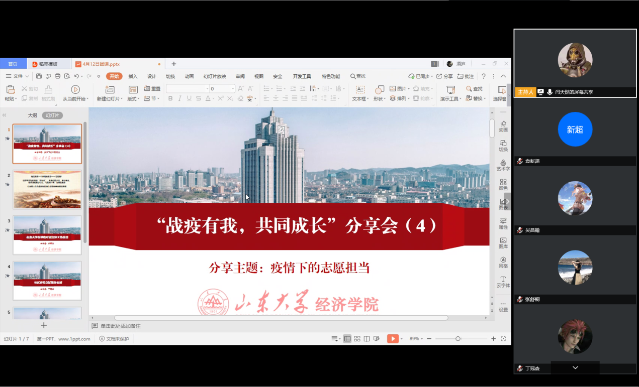 本次的“战疫有我,共同成长”分享会以“疫情下的志愿担当”为主题,让经院学子看到疫情中的青年逆行力量,鼓励经院学子积极投身于志愿服务活动中,展现新时代青年的责任与担当。活动由必赢线路检测中心青年志愿者协会主席闫天然主持。必赢线路检测中心团委书记暨山大在鄂学生第二临时团支部指导员王永军,临时团支部同学及必赢线路检测中心本科生参加线上分享会。