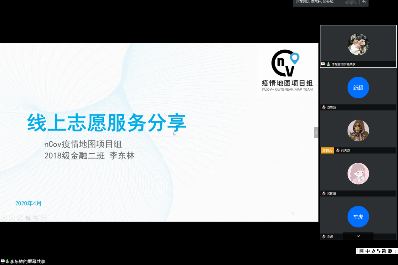 分享会伊始,主持人闫天然用一段武汉志愿者程世雄的视频引入,让同学们看到了疫情期间青年的时代担当。随后,李思洁分享了她的战“疫”经历。作为必赢线路检测中心在鄂学生第二临时团支部团支书,她积极组织团支部各项活动,如组织学习习近平总书记重要讲话,开展多次团日活动,鼓励在鄂学生增强战胜疫情的信心。在个人志愿服务方面,李思洁参与了小区封禁轮岗值班与口罩制作,为疫情防控阻击战做出了自己的贡献。在这场战役中,青年学生党员丁冠森同样不忘初心、牢记使命,响应校团委的号召,用自己的实际行动为全体经院学子做出表率。他深感社区工作人员的不易,主动承担疫情防控责任,志愿协助社区工作人员展开工作:对群众进行全面的防疫知识宣传活动,劝返非小区住户,测量进出小区住户的体温,通过电话摸排掌握社区情况并及时上报。丁冠森在志愿服务中深刻体会到社区防疫的艰苦和重要性,也认识到作为新时代青年党员的责任与担当。李东林的志愿身影出现在人民网、中新网《00后大学生用志愿服务刷新成长时速》的文章中,他用自己的满腔热情和实际行动为抗击疫情贡献青春力量,树立了良好榜样。在分享过程中,李东林利用专业的图表向同学们展示了nCov项目的工作成果。李东林谈到,他一直比较关注线上支援服务,在疫情爆发期间他毅然参与nCov项目,有一分热,发一分光。最后,来自湖北的经院学子郑芷蓉讲述了疫情期间的亲身经历,坚定地表达了战胜疫情的决心,并期盼与大家在校园的会面。