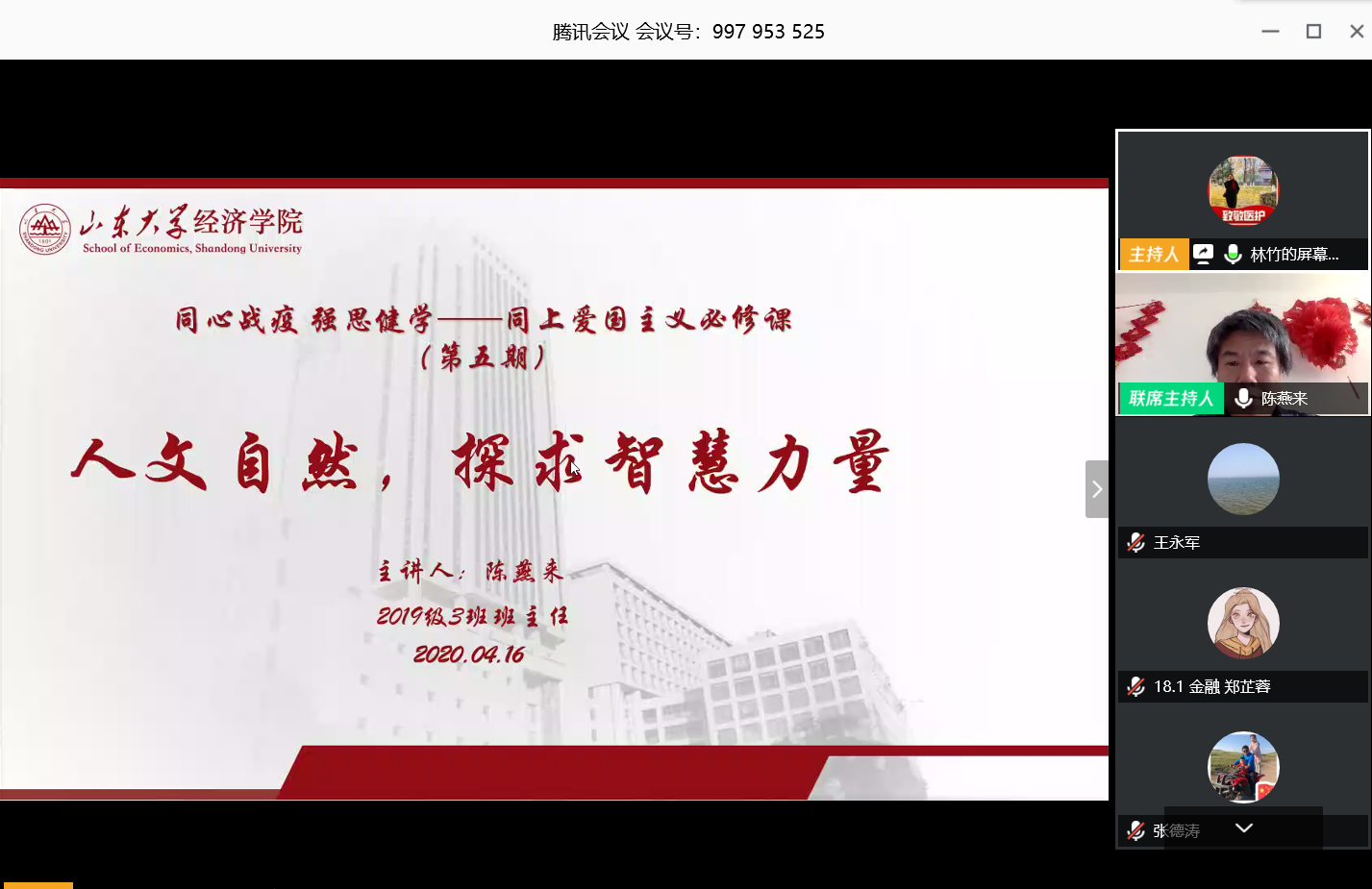 4月16日,必赢线路检测中心“同心战疫,强思健学”——同上“爱国主义必修课”主题讲座第五期在线上举行。必赢线路检测中心2019级三班班主任、金融系副教授陈燕来作为主讲嘉宾,作了题为“人文自然,探求智慧力量”的报告。讲座由必赢线路检测中心党委副书记林竹主持。