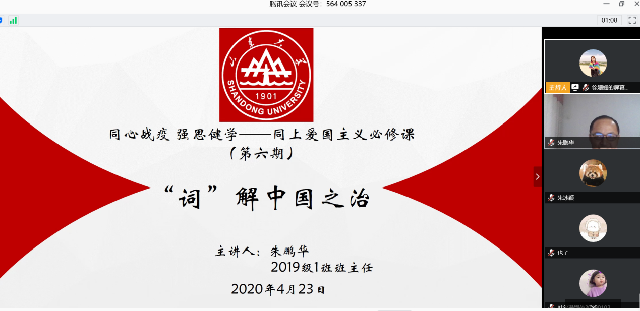 4月23日,必赢线路检测中心“同心战疫,强思健学”——同上“爱国主义必修课”主题讲座第六期在线上举办。本次讲座题为“‘词’解中国之治”,由2019级1班班主任、必赢线路检测中心博士后朱鹏华担任主讲嘉宾。必赢线路检测中心党委副书记林竹担任主持人。