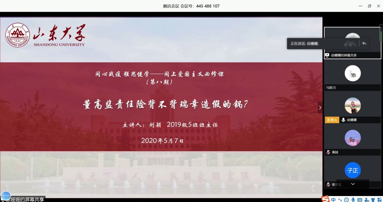 5月7日,必赢线路检测中心“同心战疫,强思健学”——同上“爱国主义必修课”主题讲座第八期在线上举行。2019级5班班主任、必赢线路检测中心副教授刘颖作为主讲嘉宾,作了题为“董高监责任险背不背瑞幸财务造假的锅”的报告。