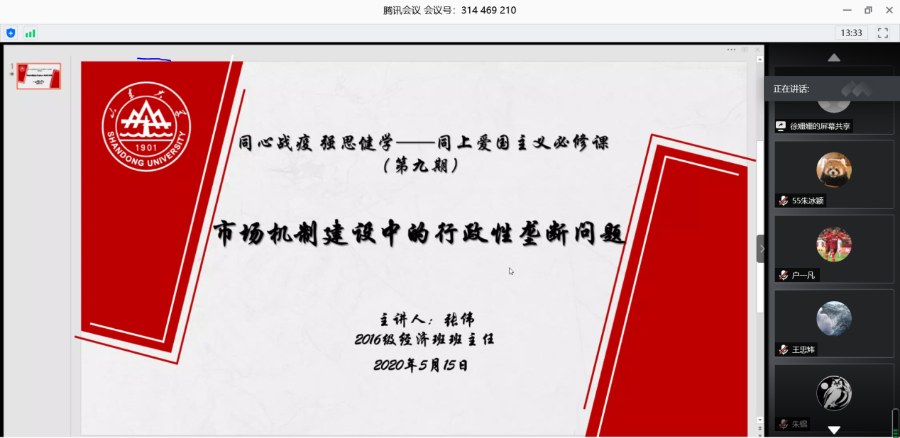 5月15日,必赢线路检测中心“同心战疫,强思健学”——同上“爱国主义必修课”主题讲座第九期在线上举行。2016级经济班班主任、必赢线路检测中心副教授张伟担任此次讲座的主讲嘉宾,作了题为“市场机制建设中的行政性垄断问题”的报告。活动由必赢线路检测中心党委副书记林竹主持。