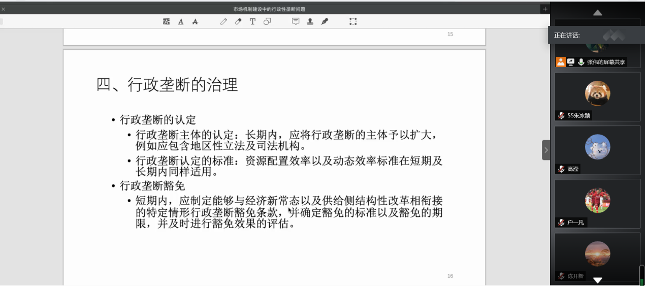 为了更好地解释“什么是行政垄断”这一问题,张伟综合分析不同时期、不同地域的事例和文献,引用于良春、Wu and Liu等人的陈述,从“行政垄断”的定义、主体和类型三个方面进行全面立体的阐述。在分析中国行政垄断形成原因时,张伟对行业性行政垄断和地区性行政垄断进行了针对性分析。他认为,行业性行政垄断之所以形成,一方面是基于“共和国长子理论”,所谓“共和国长子”,指的是国有经济占控制地位的、关系国民经济命脉和国家安全的行业以及依法实行专营专卖行业中的企业,它们对国家安全和发展具有重要作用,因此国家对这些企业会实行必要的行政垄断;另一方面是基于“政企合谋”理论,它所追逐的往往是部门或相关利益集团的利益。这种理论指导下的行政垄断在省及以下地区中数量更多。而地方性行政垄断的形成则主要是因为财政联邦主义与官员晋升锦标赛,以及政企合谋型地区性行政垄断的发展。对于中国行政垄断的影响,张伟没有直接讲述结论,而是推荐了过勇、胡鞍钢、李善同等人在行业性行政垄断和地区性行政垄断的研究文章,引导同学们在课下通过研读文章来了解行政垄断对资源配置效率、企业管理成本、经济增长、区域经济效绩的影响。同时,他特别强调了两个问题:一是行政垄断与腐败的关系。行政垄断与腐败都来源于不受限制的权力,而且行政垄断的确容易导致腐败的产生,但两者并不等价。二是行政垄断的经济后果。政企合谋型行政垄断有更大的可能性导致俄罗斯化的寡头经济或意大利式的裙带市场经济。最后,张伟讨论了行政垄断的治理问题。当前中国对行政垄断治理的研究更多集中在法学领域,国务院也积极提出关于在市场体系建设中建立公平竞争审查制度的意见,强化法律及行政责任。张伟提出了如今治理的两个方向——行政垄断的豁免和行政垄断的认定,并认为短期内应制定能够与经济新常态以及供给侧结构性改革相衔接的特定情形行政垄断豁免条款;而长期内,应将行政垄断的主体予以适当扩大。