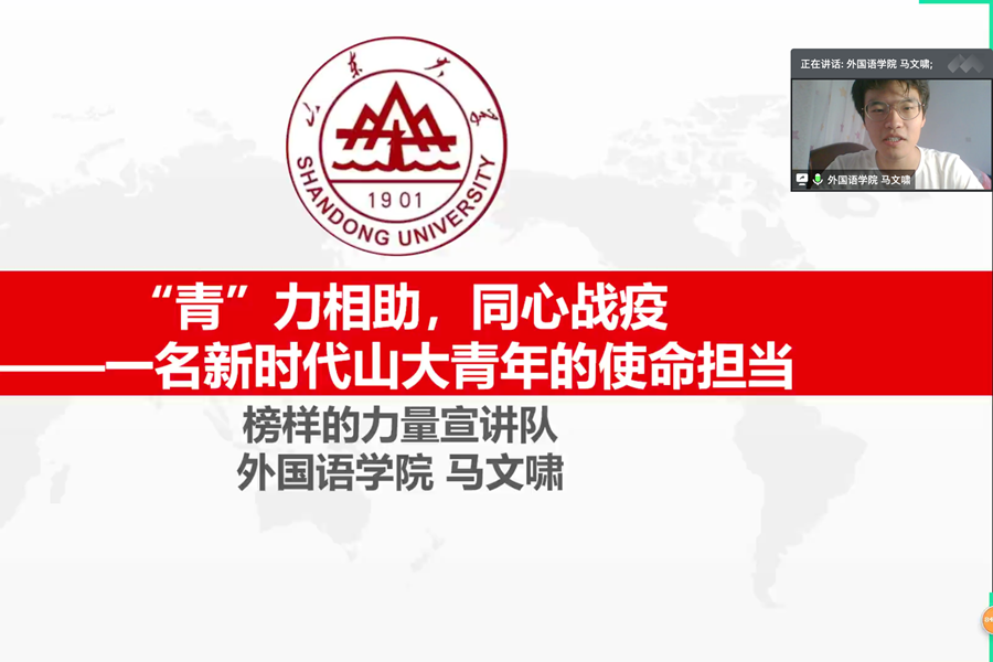 榜样的力量宣讲队成员、外国语学院2016级英语与国际政治双学位专业本科生马文啸作了题为“‘青’力相助,同心战役”的报告。青年正当时,马文啸介绍了自己“停课不停学”期间居家学习运动的自律情况,以及作为外国语学院团委副书记在坚持思想引领、联系服务学生中所做的工作。青春战疫情,马文啸主动发挥党员带头作用,投身基层防疫,并针对紧急需求组织搭建了“公译”战疫平台,为疫情防控工作助力。马文啸秉承着“向上而生,向善而行”的信念,发扬以天下国家为己任的榜样力量,展现了一名山大人的青春担当。