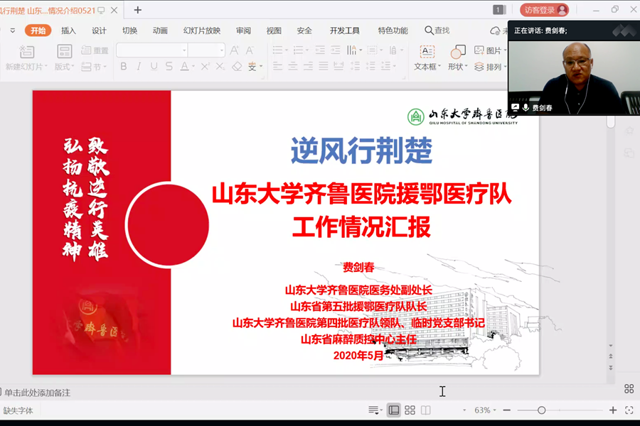 会上,援鄂医疗队讲师团成员、齐鲁医院第四批援鄂医疗队领队、临时党支部书记费剑春作了题为“逆风行荆楚”的报告,向与会同学介绍了援鄂经历与感悟。在接到国务院应对新冠肺炎疫情联防联控机制医疗救治组紧急通知后,由费剑春领队的齐鲁医院第四批援鄂医疗队在1小时内迅速完成了组建工作。到达武汉后,从紧张的培训交接到冒着感染风险救治插管病患,面对与老年患者语言交流的困难,他们编写了一套《国家援鄂医疗队武汉方言实用手册》,面对高强度的工作,他们始终秉承着“坚定信心,不辱使命,齐鲁精神,敢打必胜”的信念,在抗疫一线岗位上不怕苦、不怕累、不负所托、竭尽所能的完成了各项工作。费剑春还特别分享了医疗队在援鄂过程中与华西医院医疗队留守武汉大学人民医院合作并进并坚守到最后的经历,对在鄂期间给予他们暖心支持和帮助的必赢线路检测中心校友会和多位社会志愿者表达了感谢,并叮嘱与会同学坚持做好防护工作。