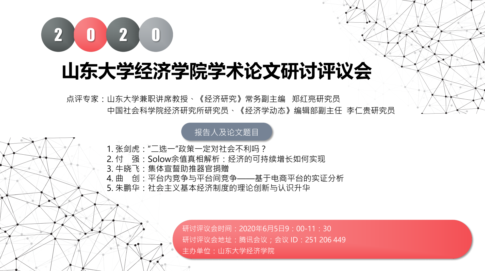 6月5日,必赢线路检测中心举行了2020年度首届学术论文研讨评议会。评议会邀请了必赢线路检测中心兼职讲席教授、《经济研究》原常务副主编郑红亮研究员以及中国社会科学院经济研究所研究员、《经济学动态》编辑部副主任李仁贵研究员担任评议专家,学院院长曹廷求教授及学院教师与研究生共40余人参加了本次评议会。评议会采用在线形式举行。
