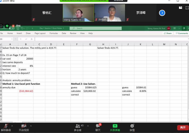 7月6日上午8时,美国蒙大拿州立大学Joshua Hill教授的“产业组织经济学”与美国内华达大学迟健心教授的“美联储与金融市场”率先开课。同日开课的还有来自美国昆尼皮亚克大学王学武教授的“金融建模与分析(Excel)”和英国约克大学鞠源教授的“谈判与联盟”。其中Joshua等三位教授已是第二年参加学院海外师资课程的授课。作为新课,王学武教授的“金融建模与分析(Excel)”则主要探讨了标准财务模型和数据分析领域的资本预算,财务报表分析,资产定价,投资组合管理和业绩等,以及如何使用计算机(Excel)提取、建模和分析数据,具有很强的实操性。