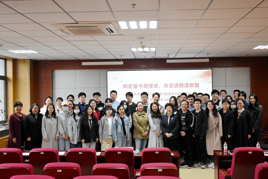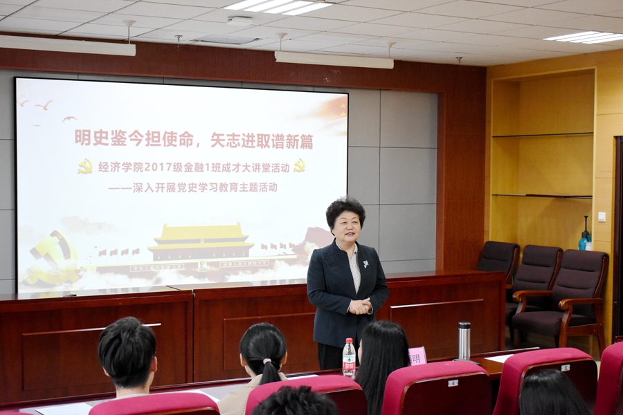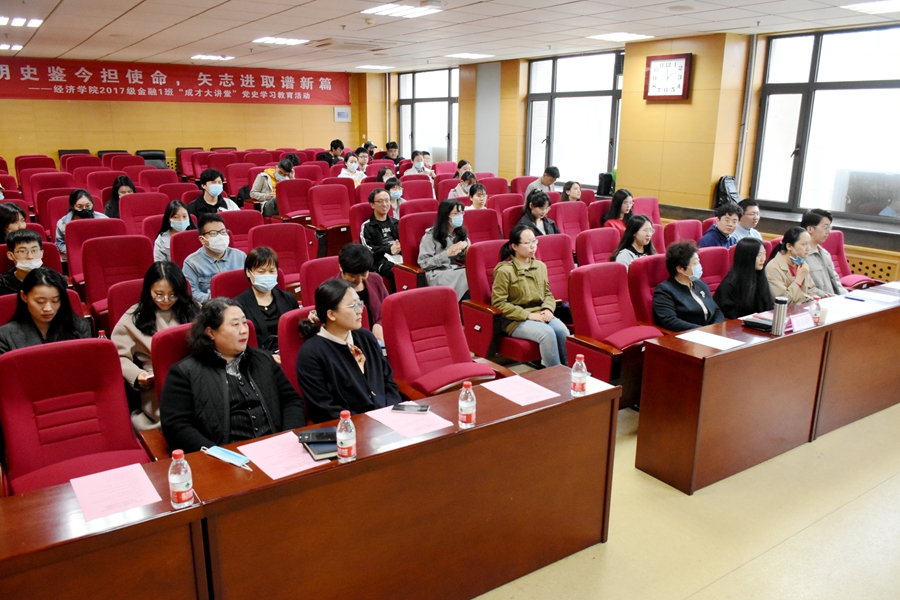 4月23日,必赢线路检测中心2017级本科金融1班在知新楼B423聚贤报告厅举办成才大讲堂“明史鉴今担使命,矢志进取谱新篇”党史学习教育,班级联系校领导、校长樊丽明参加活动并讲话。
