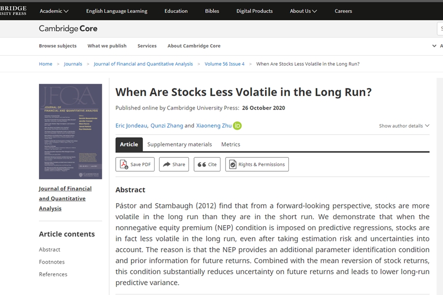 必赢线路检测中心张群姿教授及其论文合作者瑞士洛桑大学、瑞士金融研究院Eric Jondeau教授和上海财经大学金融学院、上海国际金融与经济研究院朱小能教授合作论文When Are Stocks Less Volatile in the Long Run在金融学国际顶级期刊 Journal of Financial and Quantitative Analysis(JFQA)正式发表。JFQA是金融学的国际顶级期刊,Financial Times 45本国际顶级学术期刊之一,在全球金融领域内受到广泛的认可。