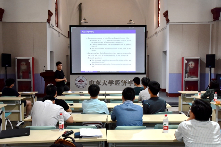 会上,报告研究了在具有递归效用的两期消费-储蓄模型中主体如何在资本收入风险和劳动收入风险之间分配有限注意力。首先,报告阐述了关注和财富禀赋、风险和时间偏好以及收入风险的大小等关键模型要素对最优关注和消费-储蓄决策的影响。随后,报告指出消费者在做出消费决策时注意力有限,而劳动收入的冲击可能无法预料,故消费者对劳动收入的冲击反应较为强烈,在非理性忽视下的非对称劳动收入和资本收入风险不对称地进入预算约束,报告人采用递归效用及两阶段模型来处理风险和时间偏好对注意力-消耗分配的影响。最后,研究发现这个简单模型可以解释美国经济中消费对收入风险的反应以及消费对收入的相对波动,但由于关注有限而造成的福利损失是不显著的。报告结束后,与会老师就报告中的有关问题与尹鹏辉进行了交流探讨。